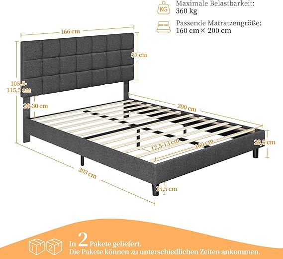 Ausgestattet mit robustem Lattenrost, stabilem Metallrahmen und massiven Stützbeinen bietet das Bett eine maximale Tragfähigkeit von bis zu 360 kg. Diese Bauweise gewährleistet eine hohe Haltbarkeit, sichere Standfestigkeit und beständige Qualität.
