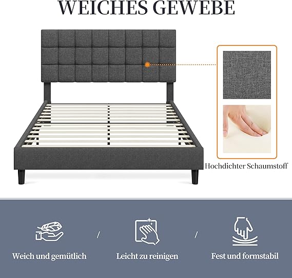 Gefertigt aus stabilem Metallrahmen, widerstandsfähigem Lattenrost aus Holz, weichem Stoffbezug und hochdichtem Schaumstoff, vereint dieses Bett Komfort mit Robustheit. Die solide Verarbeitung verspricht eine lange Lebensdauer und zeitlose Eleganz.