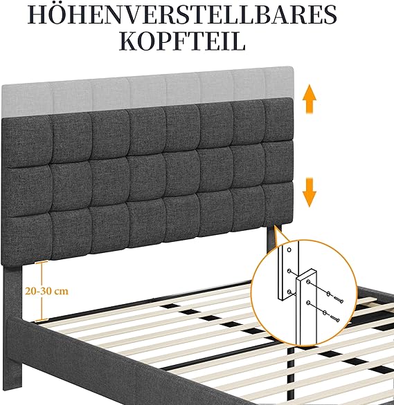 Das gepolsterte Kopfteil lässt sich auf zwei Höhen (105 cm oder 115 cm) einstellen und passt sich damit ideal an unterschiedliche Matratzendicken an. So erhalten Sie individuellen Komfort und eine moderne Optik, die sich optimal in jedes Schlafzimmer einfügt.