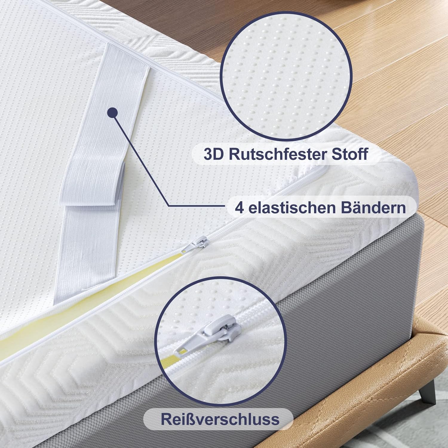 Der hochwertige Bezug ist atmungsaktiv, besonders angenehm auf der Haut und mit praktischen Gummibändern sowie einer rutschfesten Unterseite ausgestattet. Der Reißverschluss ermöglicht ein einfaches Abnehmen und Waschen.