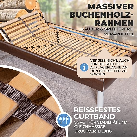 Ein robuster Mittelgurt hält die Leisten sicher in Position und verhindert Verrutschen. Perfekte Größe für Jugendbetten, Gästezimmer oder kleinere Räume.