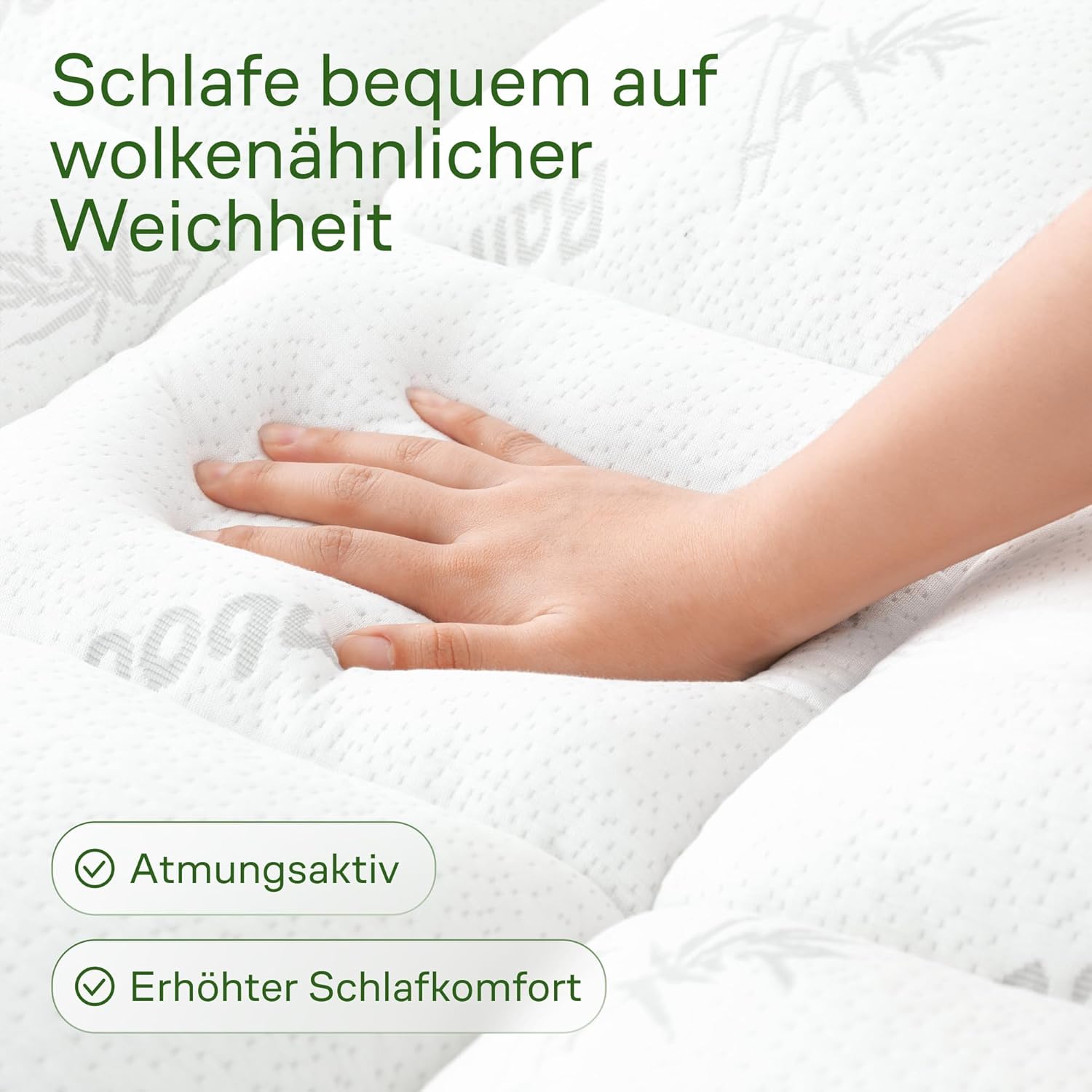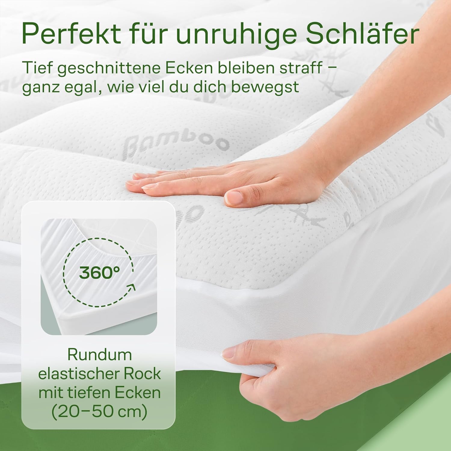 Crafted from 40% natural bamboo fibers, this cooling mattress topper is ultra-soft, breathable, elastic, and gentle on sensitive skin. Designed to fit mattresses with a depth of 20–50 cm, it offers a comfortable and environmentally friendly sleep surface.