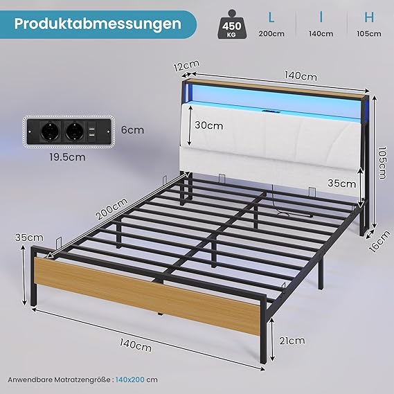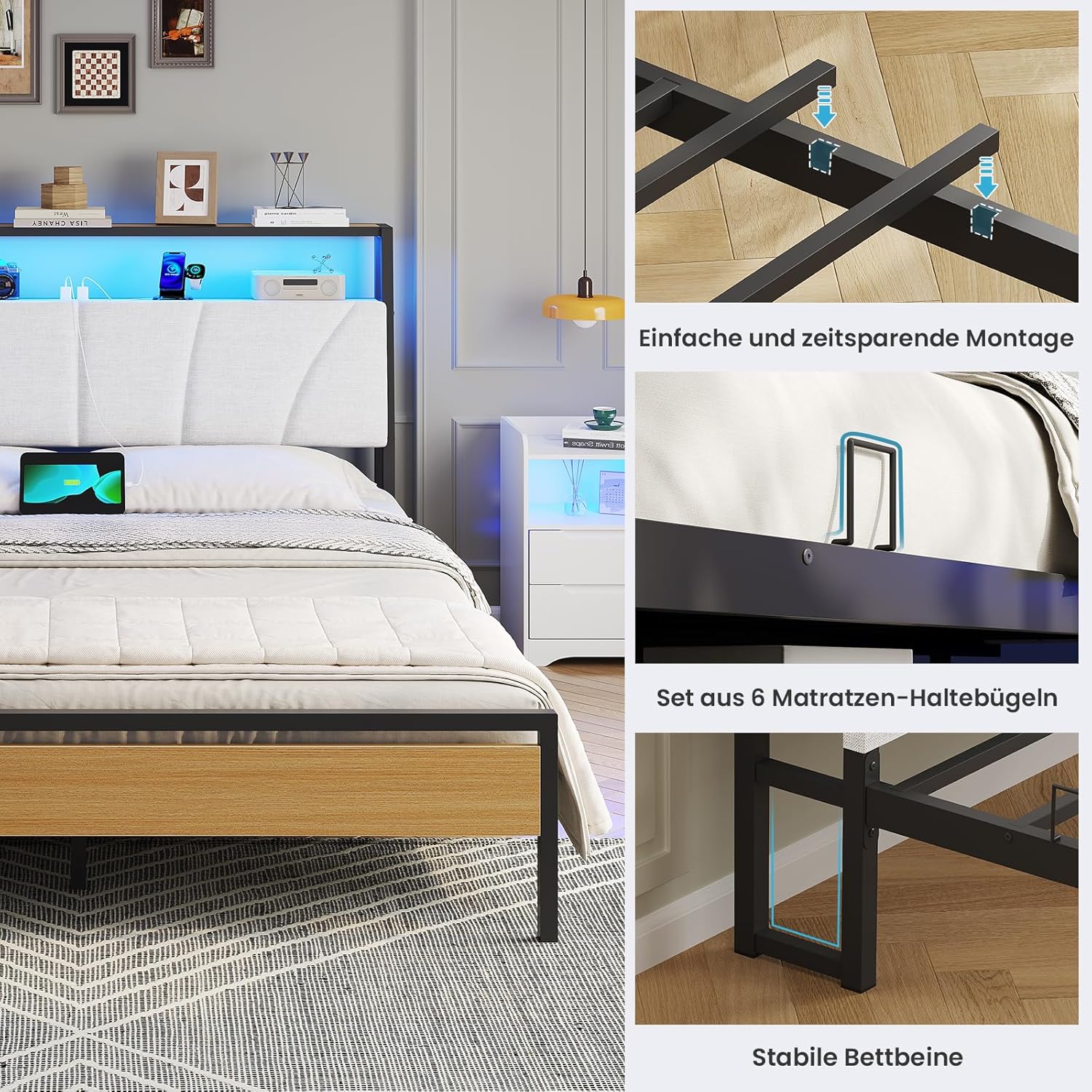 Bed 140×200 cm with LED, metal slatted frame & charging station