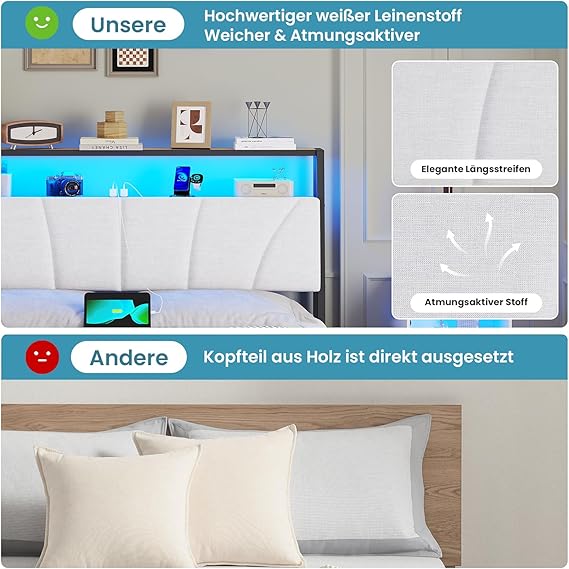 Das ergonomisch geneigte Kopfteil ist weich gepolstert und ideal zum Anlehnen beim Lesen, Fernsehen oder Entspannen. Der hochwertige Baumwoll-Leinenbezug ist hautfreundlich, angenehm im Griff und verleiht dem Bett eine elegante und wohnliche Ausstrahlung.