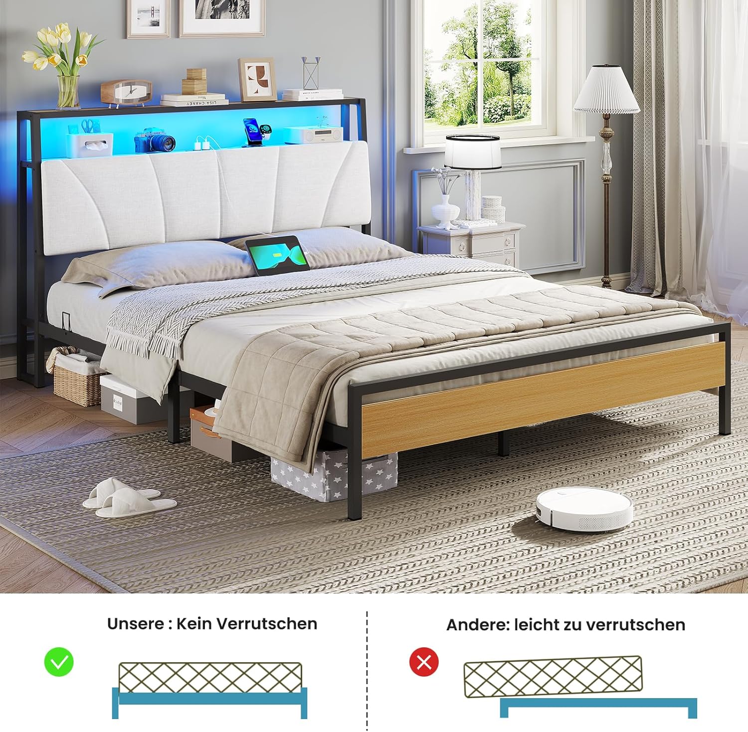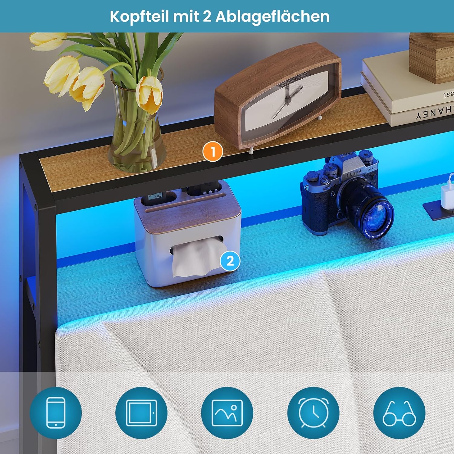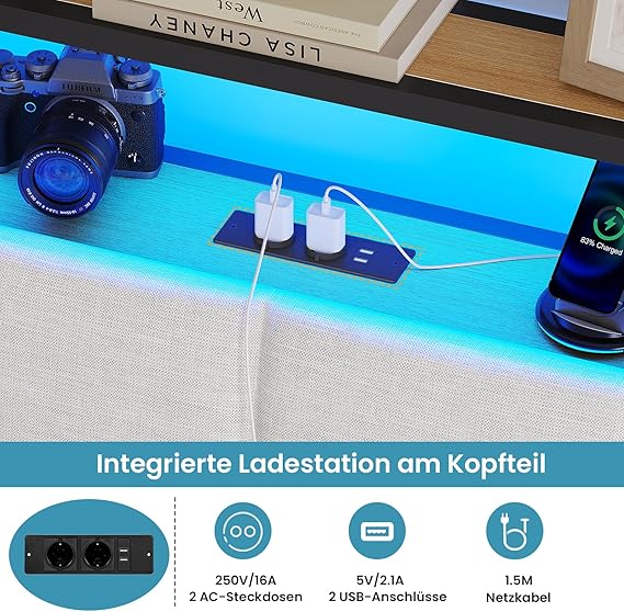 Der Bettrahmen verfügt über eine integrierte Ladestation im Kopfteil mit 2 AC-Steckdosen und 2 USB-Anschlüssen. So lassen sich Smartphone, Tablet oder Kopfhörer bequem aufladen, ohne zusätzliche Steckdosen zu blockieren. Zwei Regalböden im Kopfteil bieten Stauraum für Bücher, Wecker oder Accessoires.