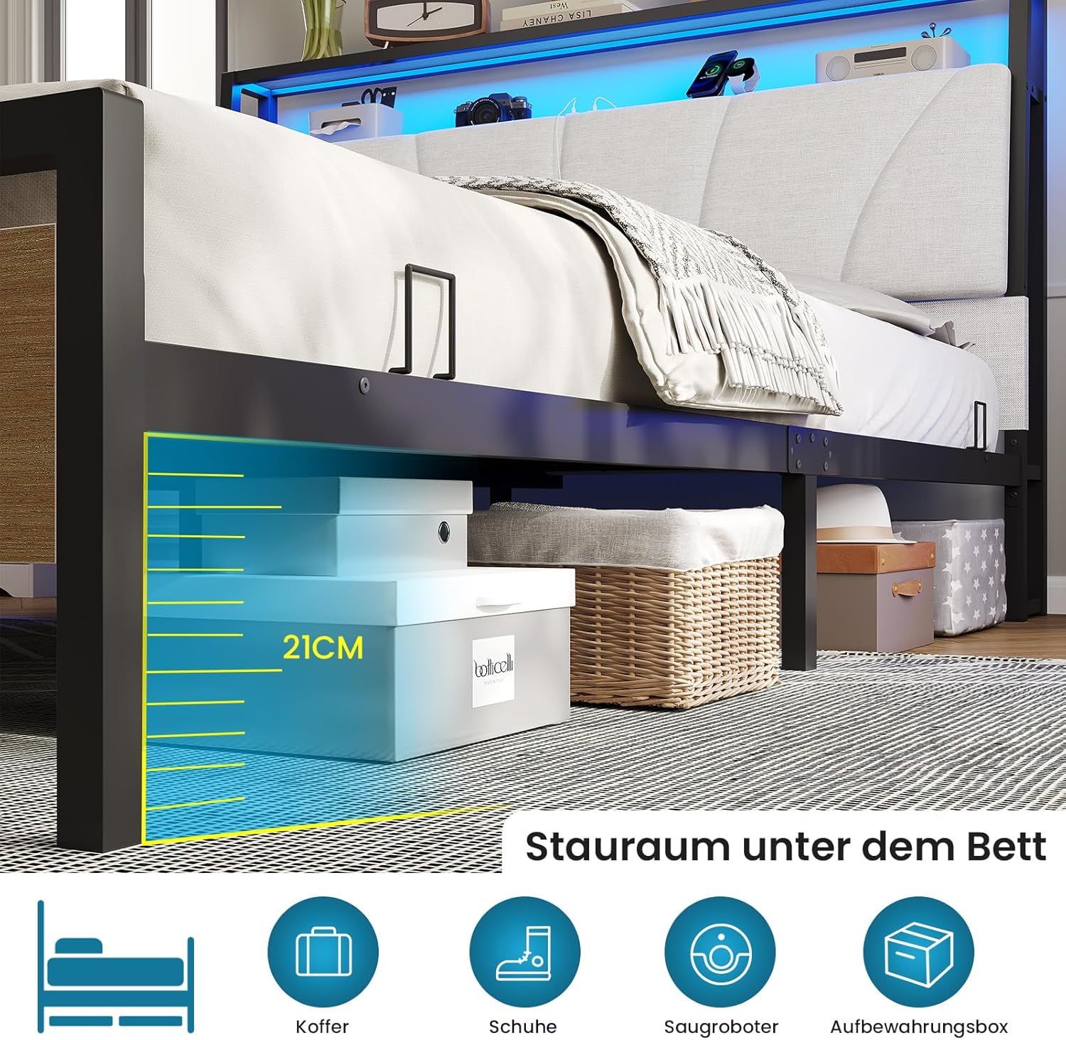 Mit 21 cm Bodenfreiheit eignet sich der Bereich unter dem Bettgestell ideal zur Aufbewahrung von Koffern, Boxen oder saisonaler Kleidung. Der Freiraum erleichtert auch die Reinigung, da Staubsauger und Saugroboter problemlos darunter fahren können.