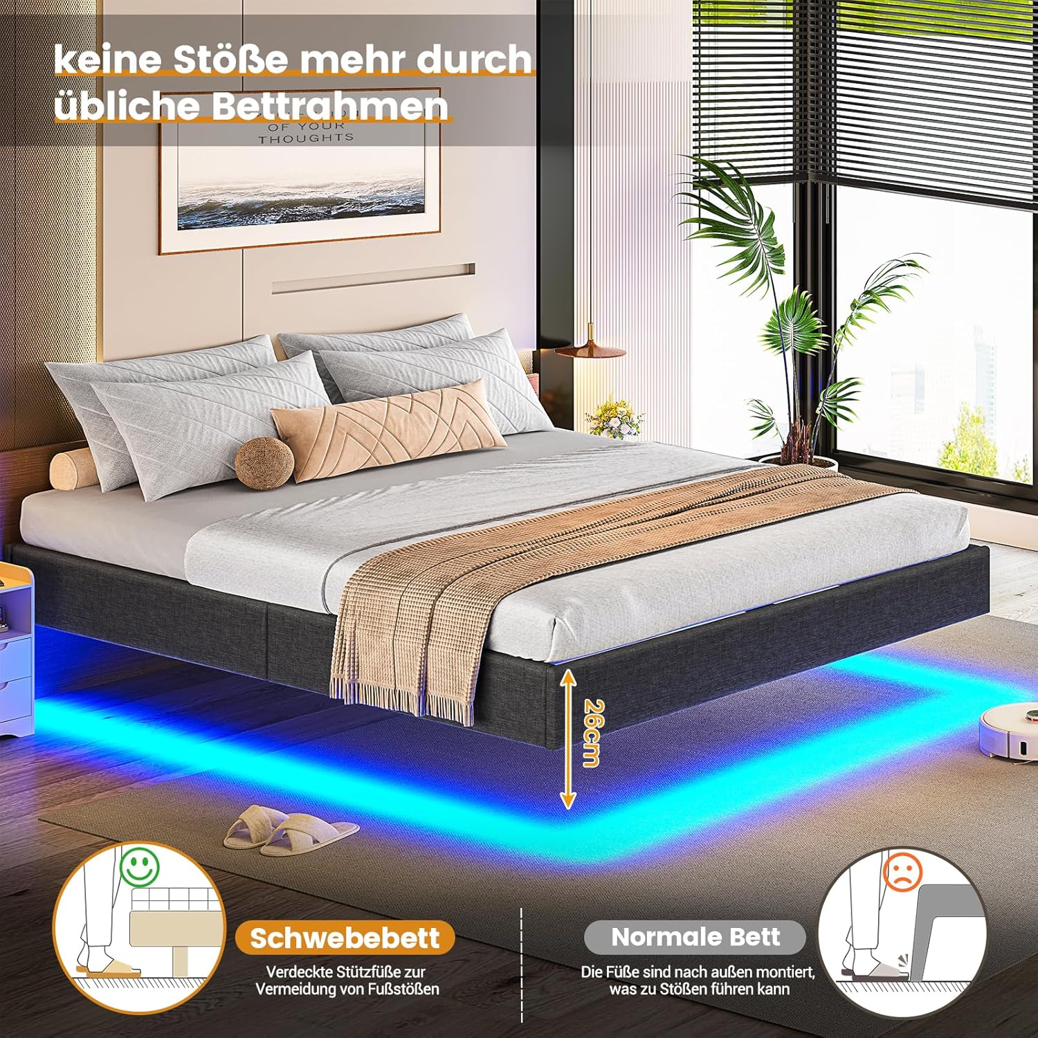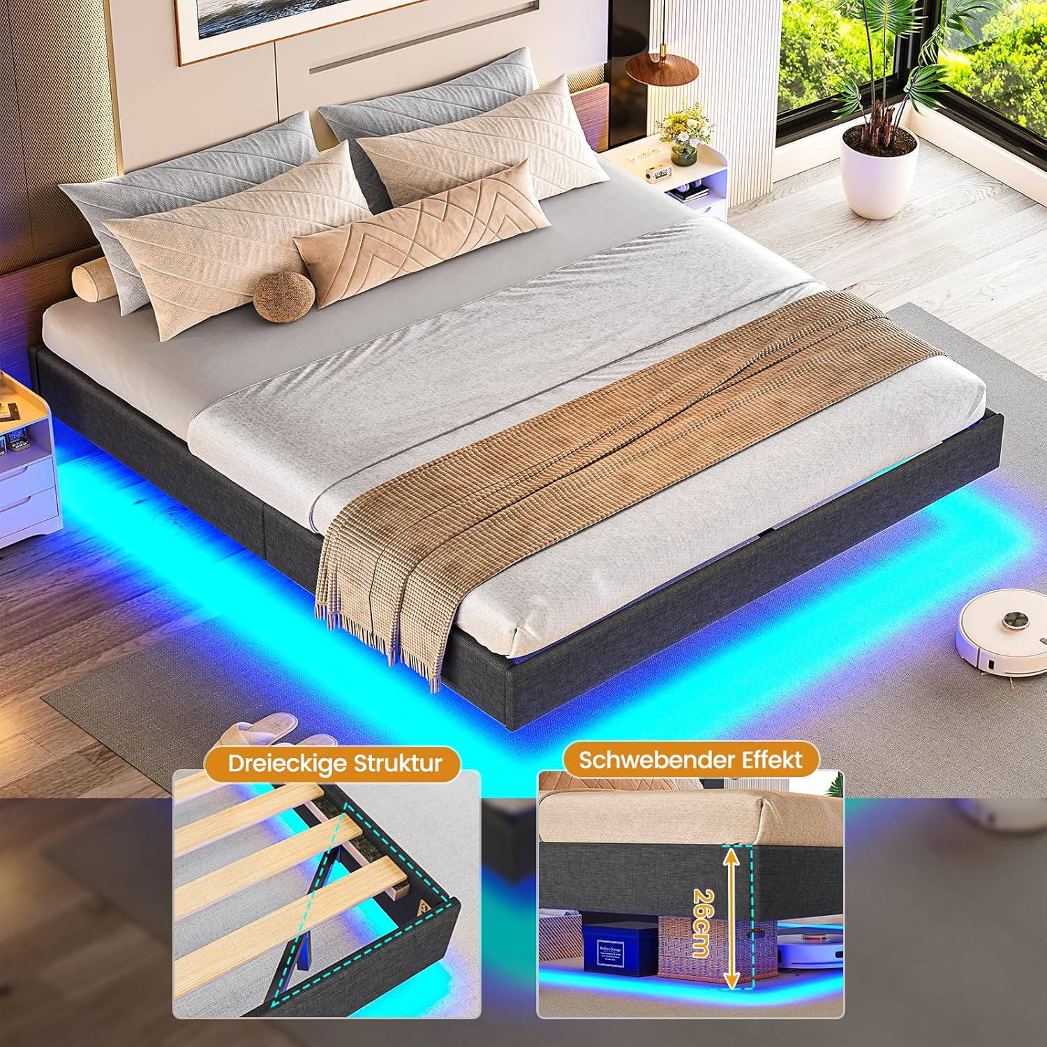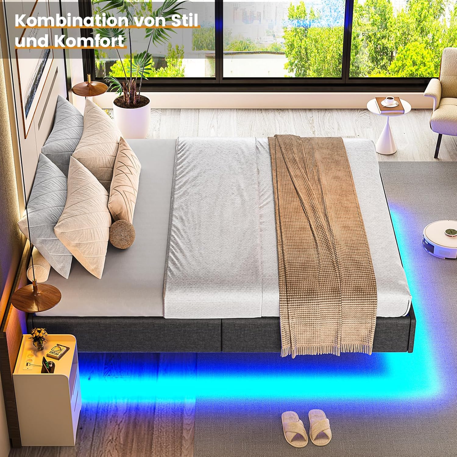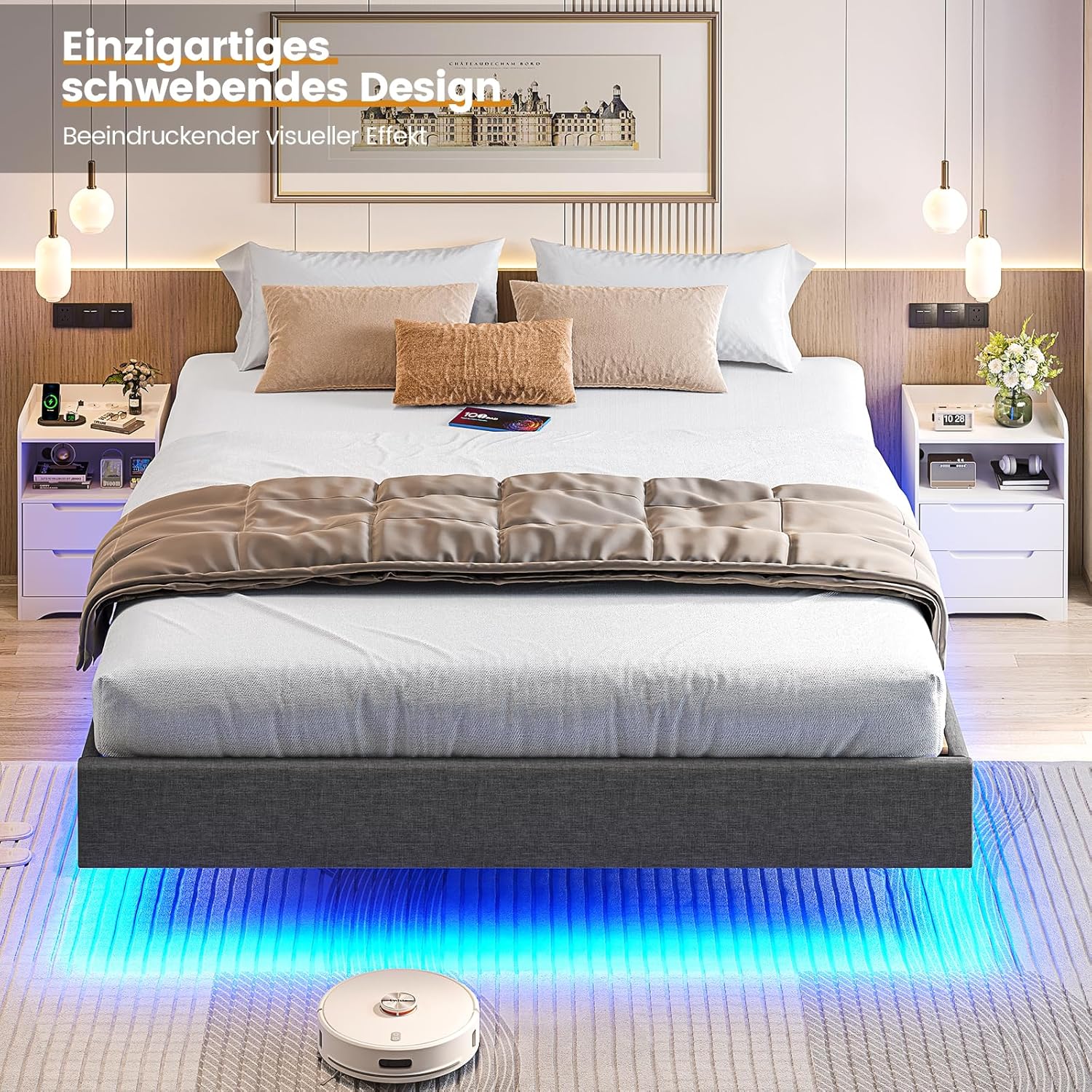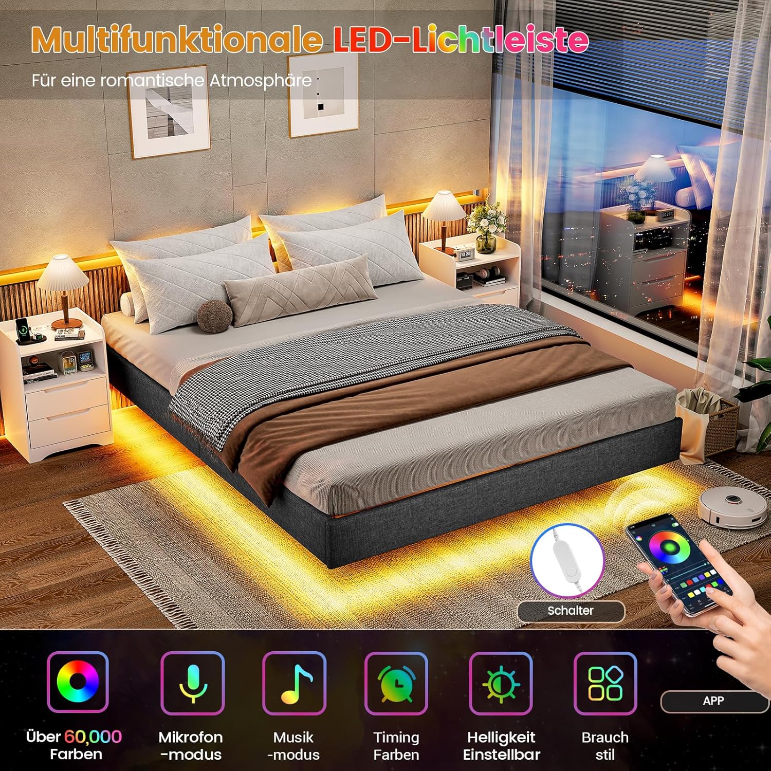 Eingebaute LED-Streifen an drei Seiten des Bettrahmens bieten nicht nur dezente Nachtbeleuchtung, sondern auch ein futuristisches Ambiente. Gesteuert per App oder Taste lassen sich über 60.000 Farben, Helligkeit und verschiedene Modi einstellen. Der integrierte Musikmodus synchronisiert Lichtfarbe und -rhythmus mit Ihrer Lieblingsmusik – ideal für eine stimmungsvolle Atmosphäre im Schlafzimmer.