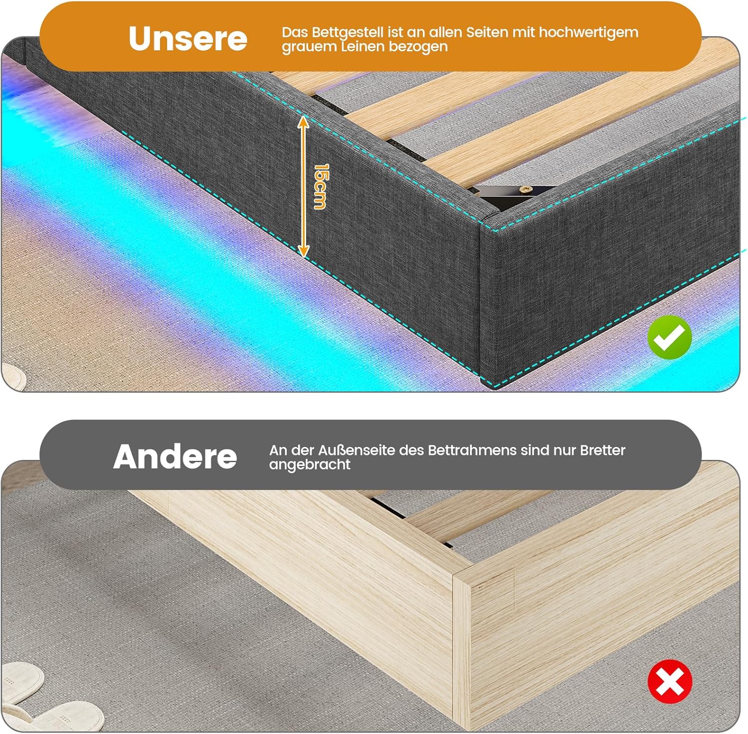 Die hochwertige Polsterung mit strapazierfähigem Leinenstoff schützt nicht nur vor Stößen, sondern verleiht dem Bettgestell auch eine elegante Optik. Das durchdachte Design reduziert quietschende Geräusche und ermöglicht, die Matratze direkt aufzulegen – ohne zusätzliches Zubehör.