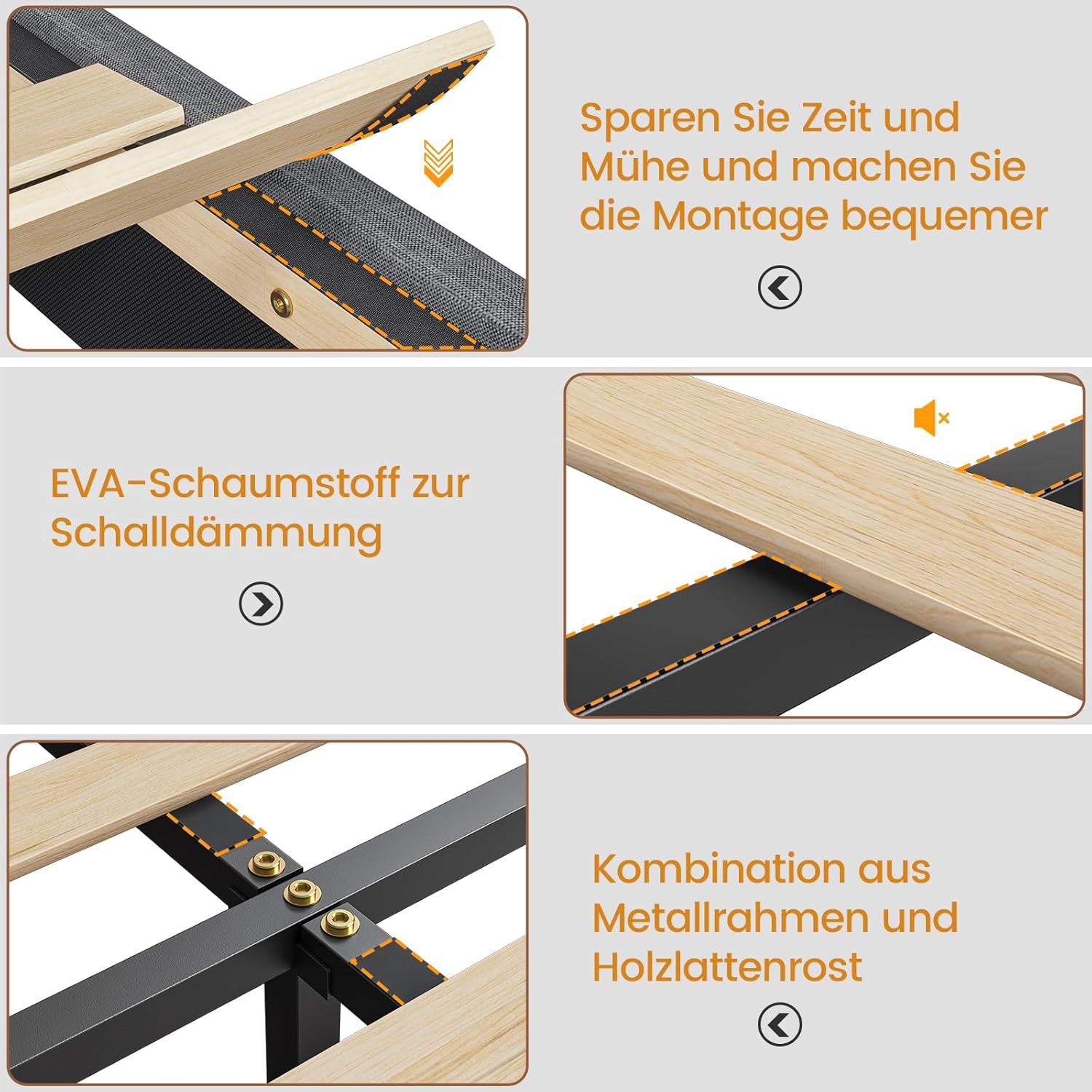 Der Rahmen aus massivem Metall und dicht angeordneten Holzlatten bietet hervorragenden Halt mit einer Tragkraft von bis zu 400 kg. Verstärkte Verbindungen sorgen für zusätzliche Stabilität – ideal für erholsamen Schlaf ohne störende Geräusche oder Bewegungen.