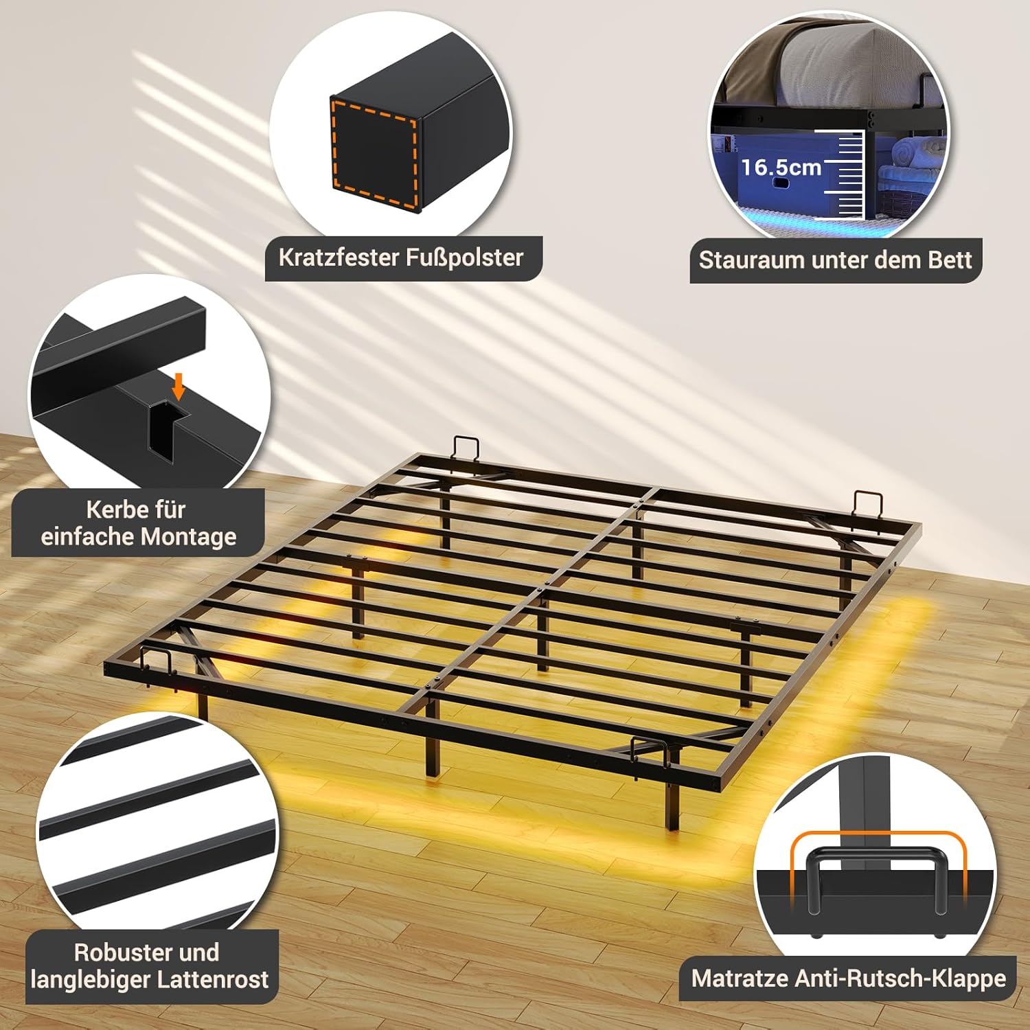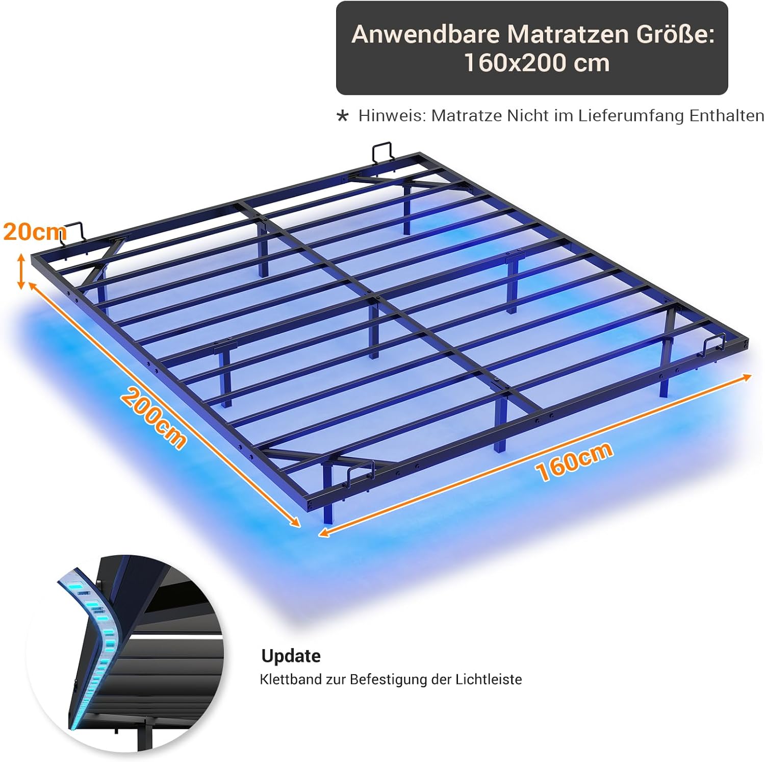 Das 160 × 200 cm große schwebende Bettgestell wird von stabilen, innenliegenden Beinen getragen, die für zuverlässigen Halt sorgen und gleichzeitig den Eindruck erwecken, als würde das Bett in der Luft schweben. In Kombination mit den seitlich angebrachten LED-Leuchten unter dem Bett entsteht ein moderner, technologischer Look und ein einzigartiges visuelles Erlebnis.