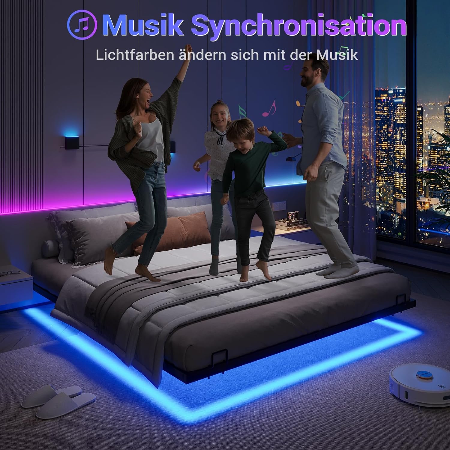 Die integrierte RGB-LED-Beleuchtung lässt sich bequem per App oder Fernbedienung steuern. Sie können Farben, Helligkeit, Modi und die Timer-Funktion individuell einstellen, um die perfekte Schlafzimmeratmosphäre zu schaffen. Im Musikmodus reagieren Lichtfarbe und Blinkrhythmus auf den Takt der Musik – ideal für stimmungsvolle Abende oder kleine Partys im Schlafzimmer.