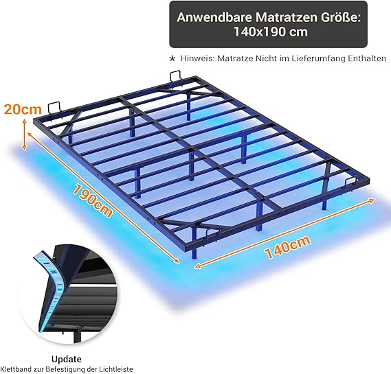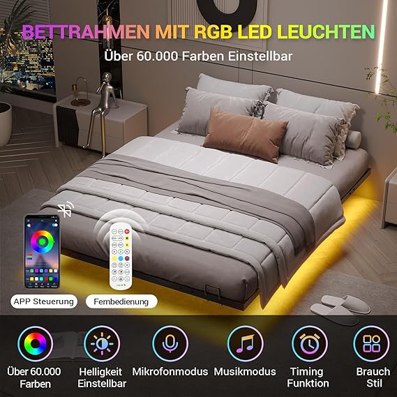 Das Bettgestell 140 × 190 cm überzeugt mit einem modernen Schwebe-Effekt. Versteckte Stützfüße sorgen für Stabilität und hohe Tragfähigkeit, während das Bett optisch wirkt, als schwebe es frei im Raum. Eine dreiseitige LED-Beleuchtung verleiht dem Schlafzimmer ein stilvolles, modernes Ambiente.