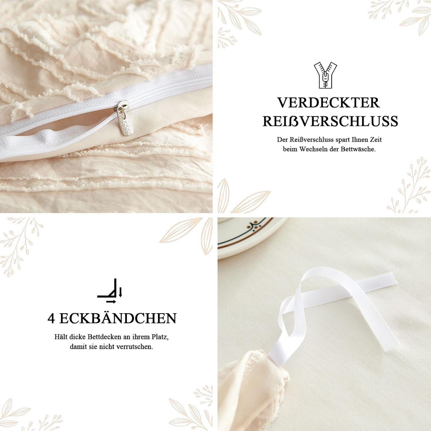 Der Bettbezug verfügt über einen verdeckten Reißverschluss und vier Eckverschlüsse, die das Beziehen erleichtern. Die Baumwoll-Bettwäsche ist maschinenwaschbar bei 40 °C, trocknergeeignet bei niedriger Temperatur, bügelbar bei geringer Hitze und darf nicht gebleicht werden.
