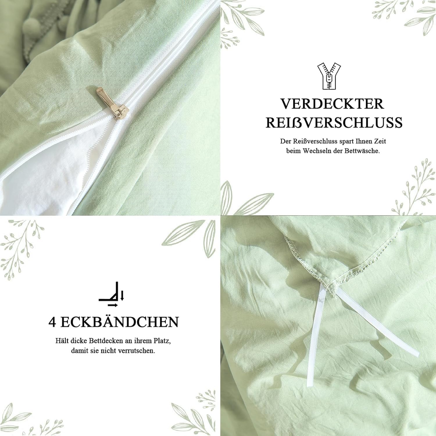 Der Bettbezug verfügt über einen verdeckten Reißverschluss und vier Eckverschlüsse, die das Beziehen erleichtern. Die Mikrofaser ist maschinenwaschbar bei 40 °C, trocknergeeignet bei niedriger Temperatur, bügelbar bei geringer Hitze und sollte nicht gebleicht werden, um die Lebensdauer zu verlängern.