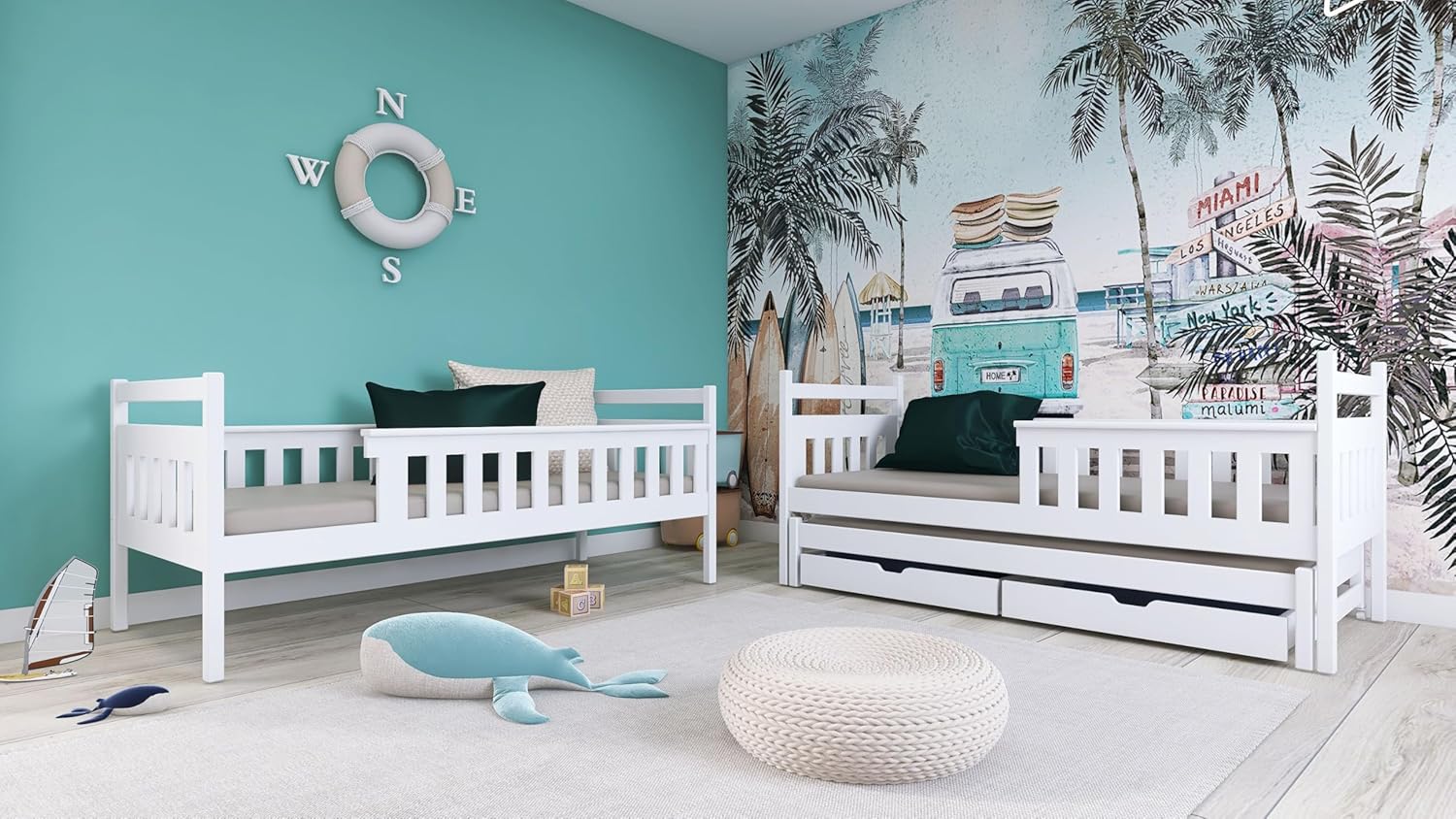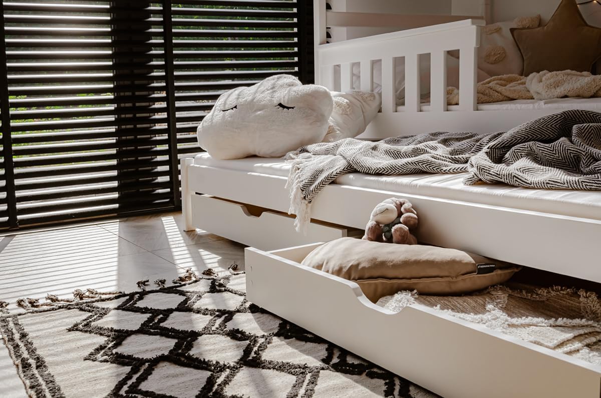 Die zwei integrierten Schubladen bieten cleveren Stauraum, damit Spielzeug, Kleidung und andere Gegenstände ordentlich verstaut werden können. So bleibt das Zimmer aufgeräumt und Kinder können beruhigt ins Bett gehen, auch in kleinen Räumen.