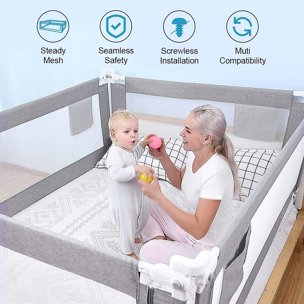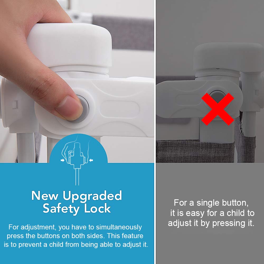 A protruding crossbar under the rail fits tightly against the mattress, eliminating unsafe gaps. The locking mechanism on the upper tube requires pressing buttons on both sides simultaneously, plus a child lock for added protection and peace of mind.