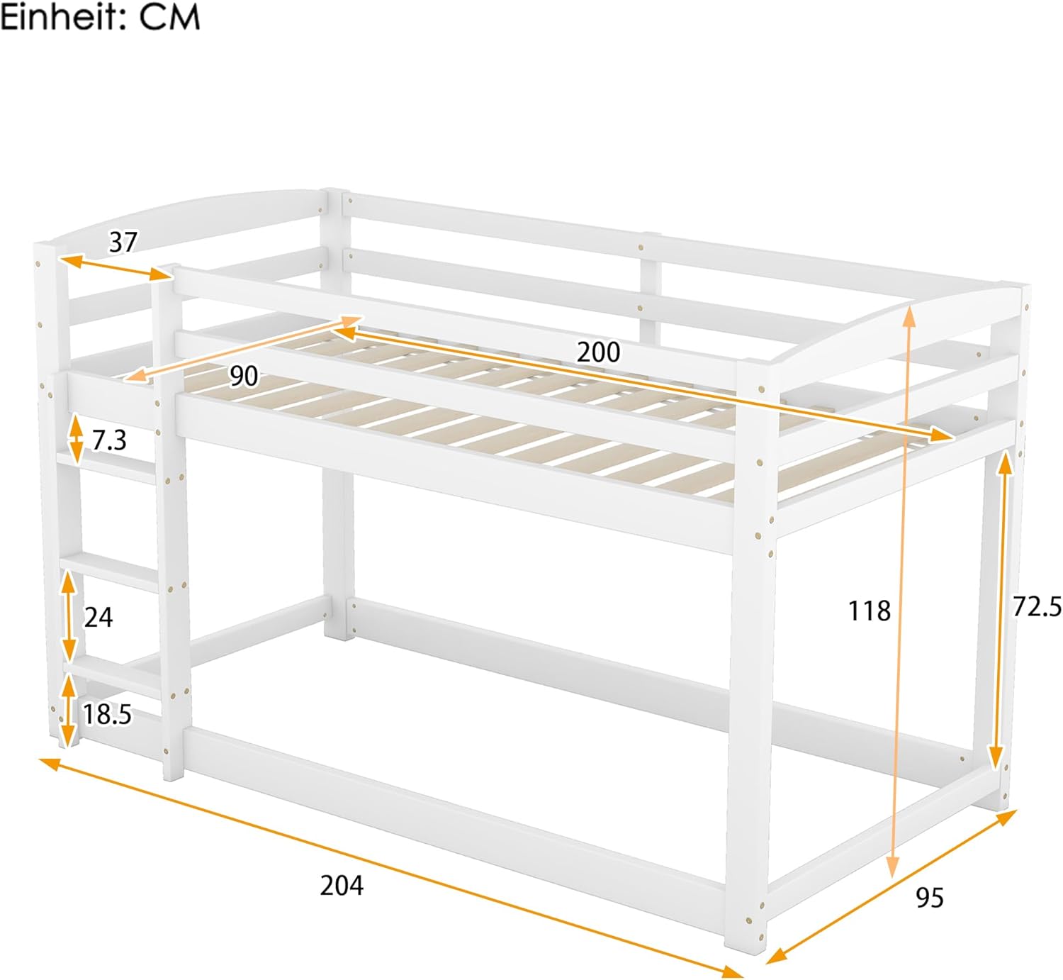 Dieses Etagenbett ist relativ niedrig, das untere Bett steht direkt auf dem Boden, wodurch die obere Liegefläche niedriger ist und das Bett für Kinder sicherer wird. Ideal auch für Räume mit niedriger Decke. Das untere Bett kann als Schlaf-, Spiel- oder Stauraum genutzt werden. -