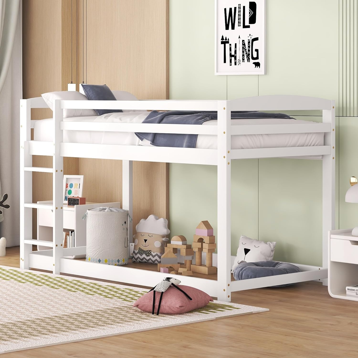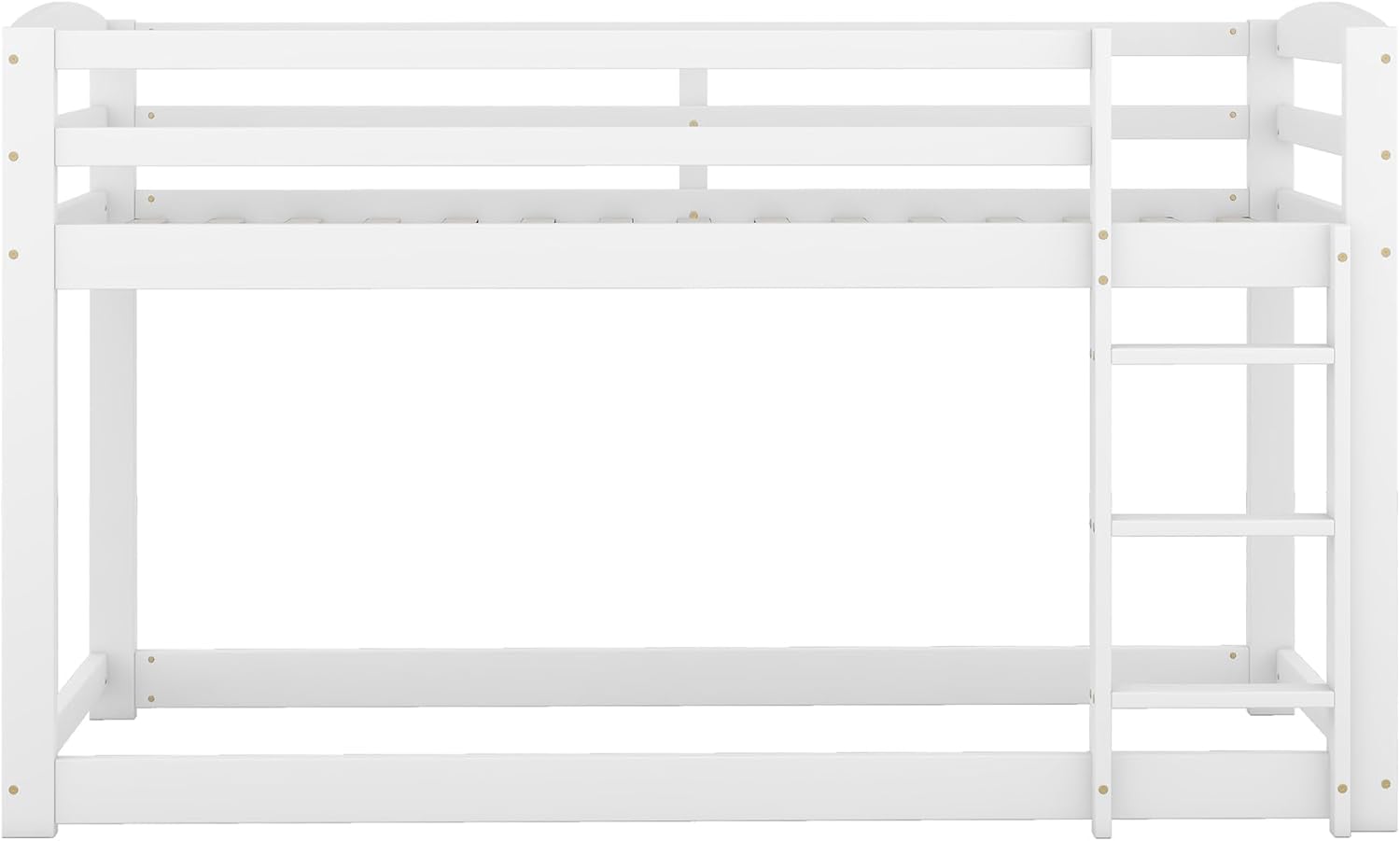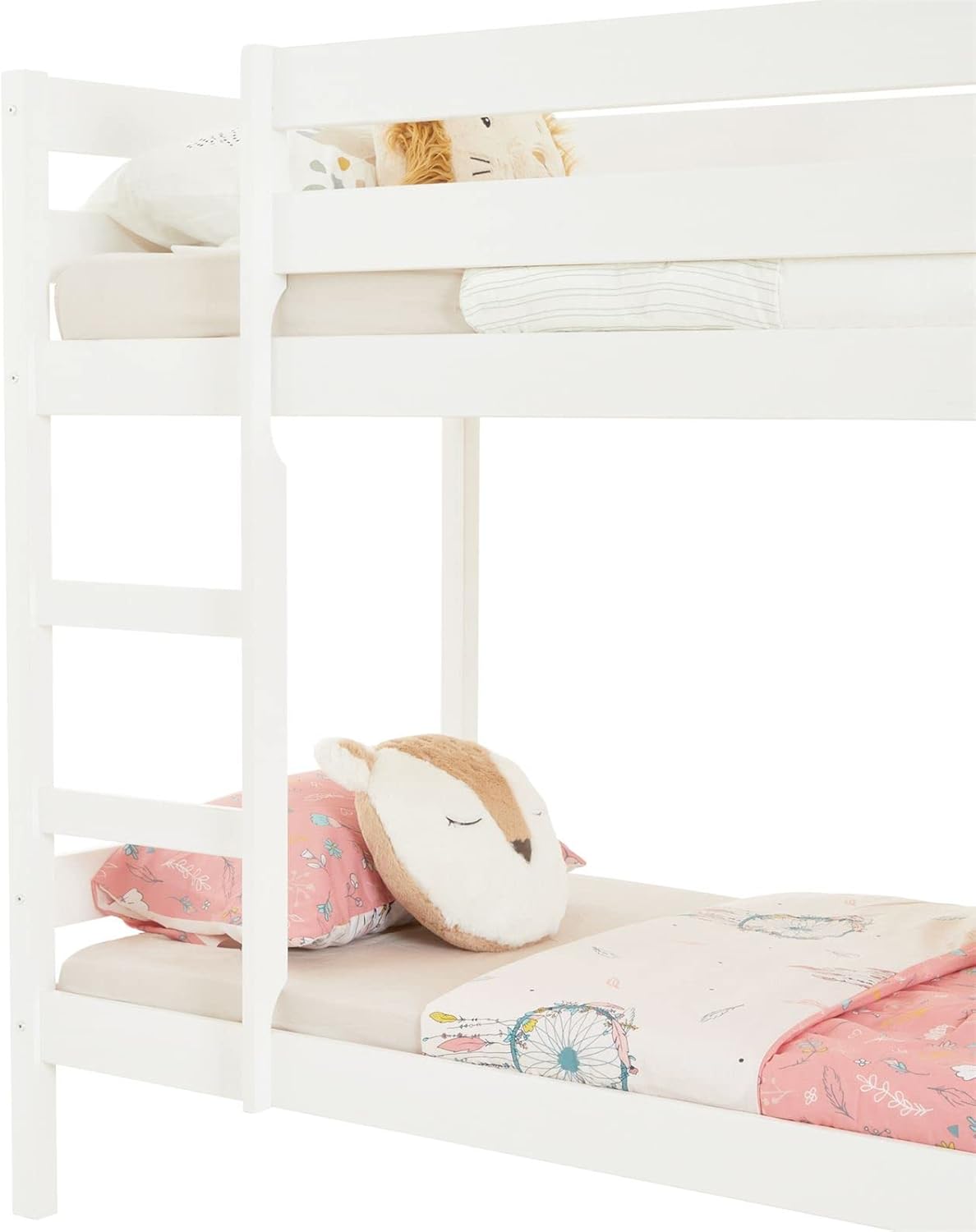 Das niedrige Etagenbett ist ideal für Familien mit kleinen Kindern. Die obere Liegefläche ist von stabilen Schutzgittern umgeben, die Leiter trägt zur Stabilität bei, und die massiven Kiefernholz-Beine sorgen für zusätzliche Stärke und Langlebigkeit des Bettes. -