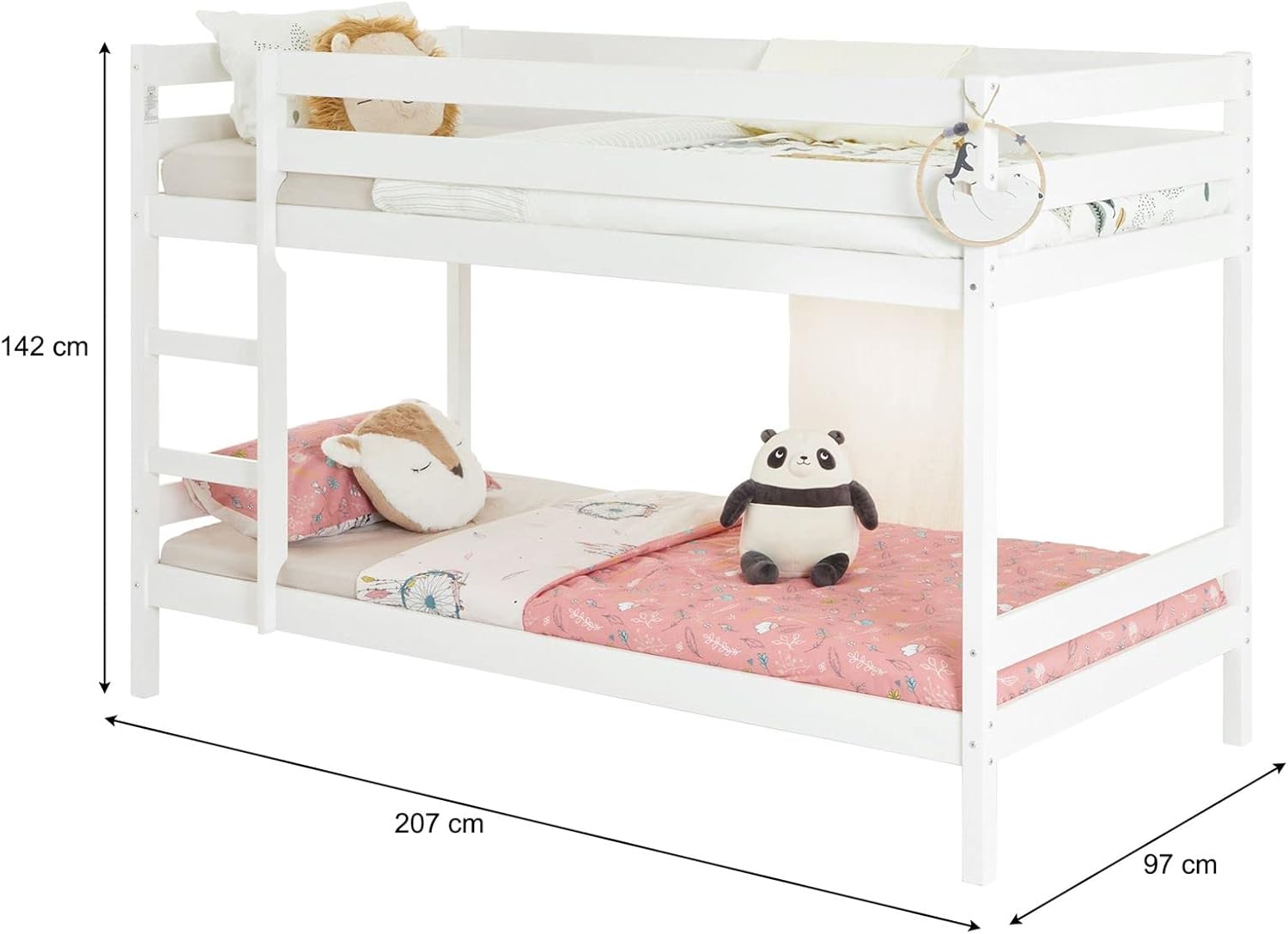 Das Kinder-Etagenbett misst 96,5 x 149 x 206 cm (Breite x Höhe x Länge) und bietet eine Liegefläche von 90 x 200 cm. Es ist ideal für Kinderzimmer geeignet und spart Platz, während es ausreichend Schlafkomfort für Kinder bietet. -