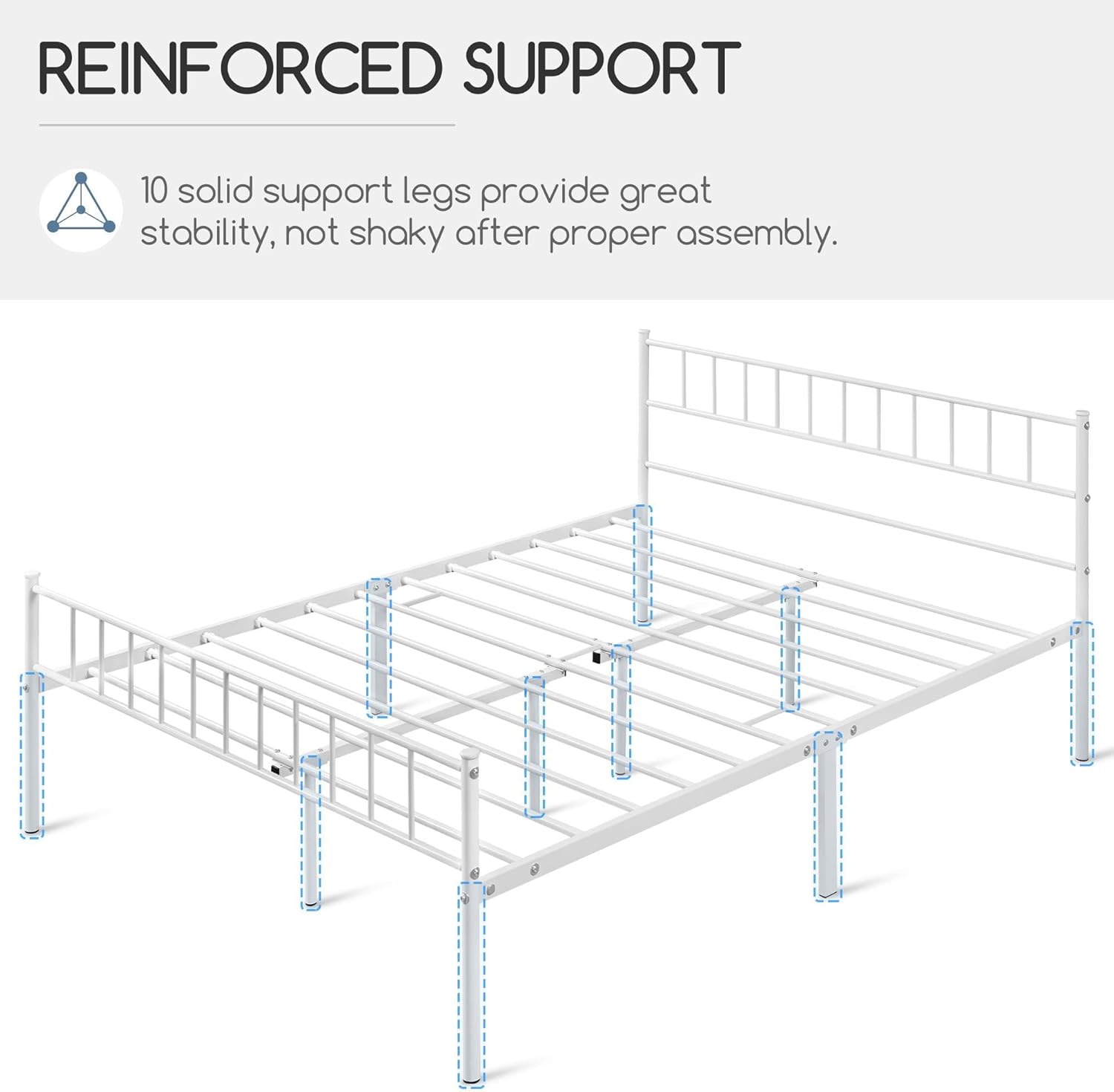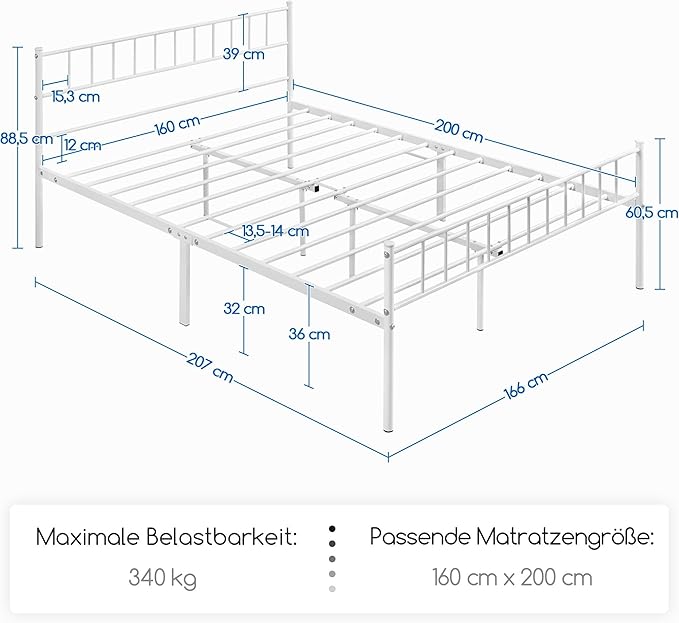 ✅ Robust und langlebig: Dieses Metallbett überzeugt durch seine stabile Konstruktion mit einem hochwertigen Lattenrost, einem hohen Kopf- und Fußteil sowie 10 massiven Metallbeinen. Die belastbare Rahmenstruktur trägt bis zu 340 kg und garantiert so eine sichere und dauerhafte Nutzung – perfekt für den täglichen Schlafkomfort.