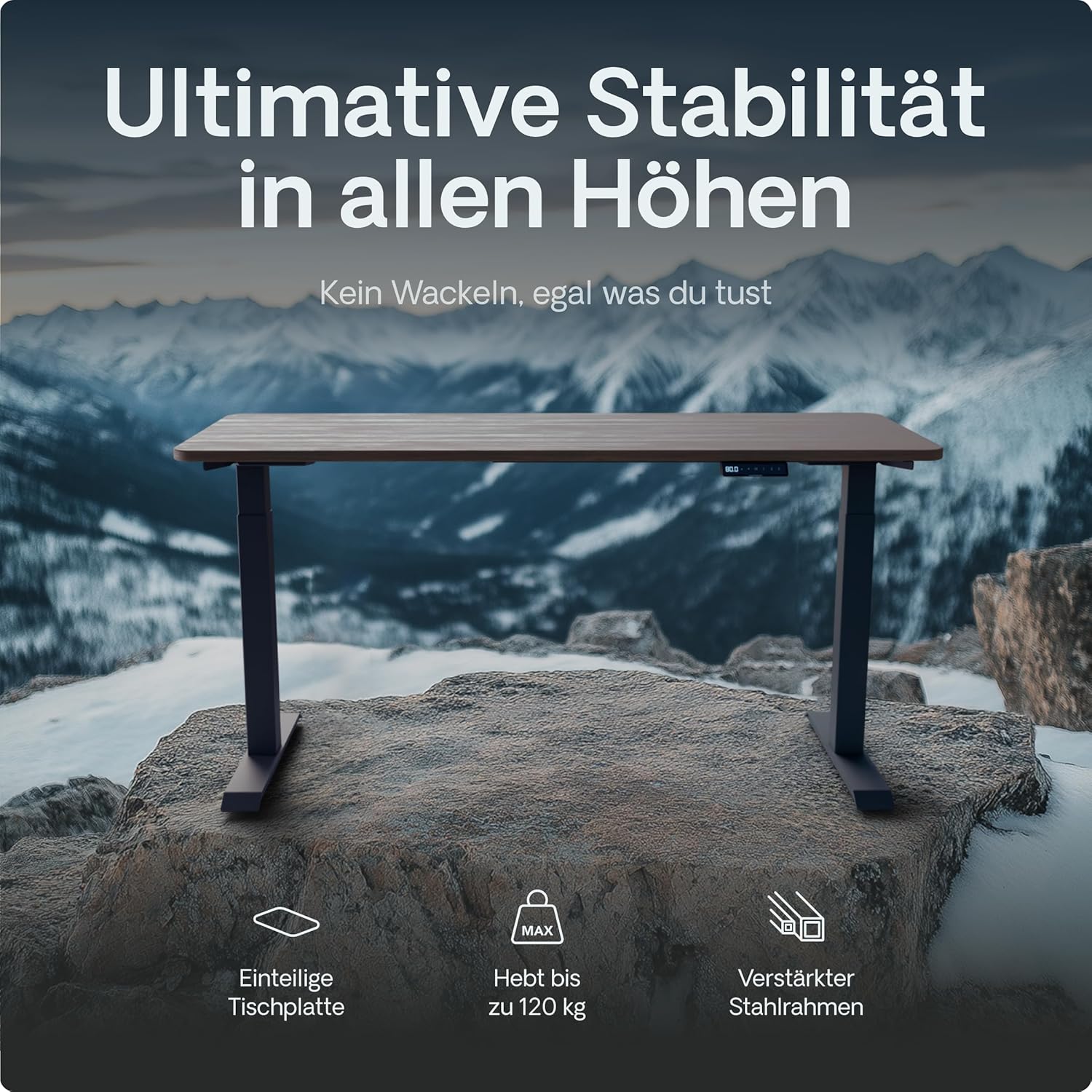 Der verstärkte Rahmen und die robusten Metallbeine des Tisches sorgen selbst in der höchsten Einstellung und bei den größten Tischplatten für Stabilität. Das dickere und breitere Rahmendesign gibt Halt, verhindert das Wackeln von Monitoren und hält Flüssigkeiten sicher in den Bechern.