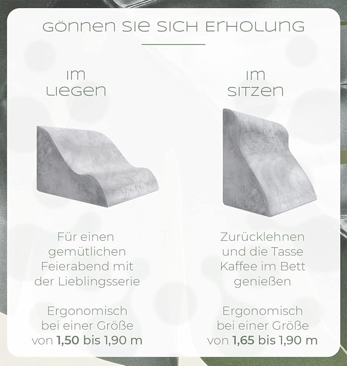 Pure Entspannung – Unterstützt Rücken und Nacken optimal durch perfekt abgestimmte Schaumstoffe. Ideal für Personen von 1,50 m bis 1,90 m Körpergröße und bis zu 100 kg Körpergewicht.
