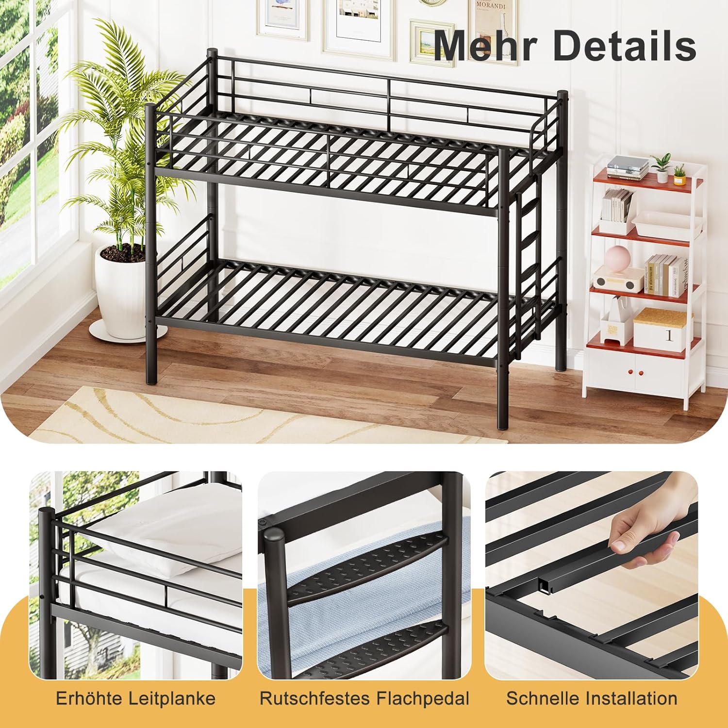 Etagenbett 90 x 200 cm mit Fallschutz und Lattenrost, in zwei Einzelbetten umwandelbar, funktionales Etagenbett – Schwarz