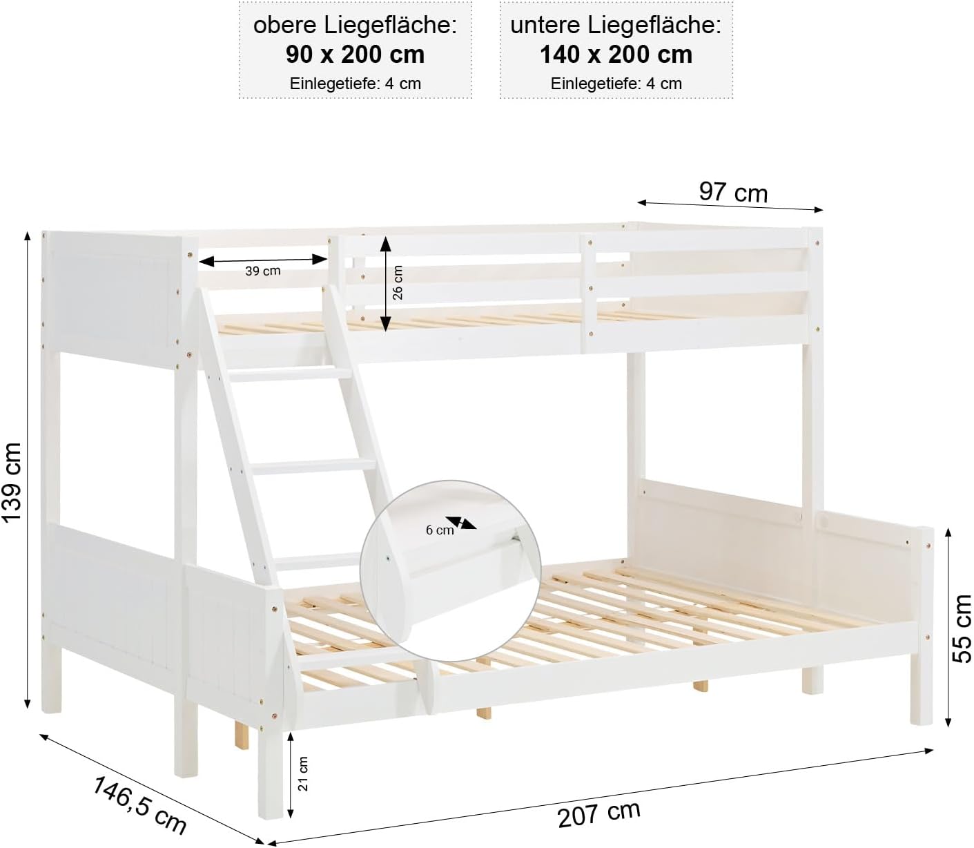 Das Bett besteht aus solidem Kiefernholz und ist stabil verarbeitet. Abgerundete Kanten und eine erhöhte Bettumrandung dienen als Absturzsicherung, sodass Kinder sicher schlafen können. Die Liegeflächen messen oben 90 x 200 cm und unten 140 x 200 cm. -