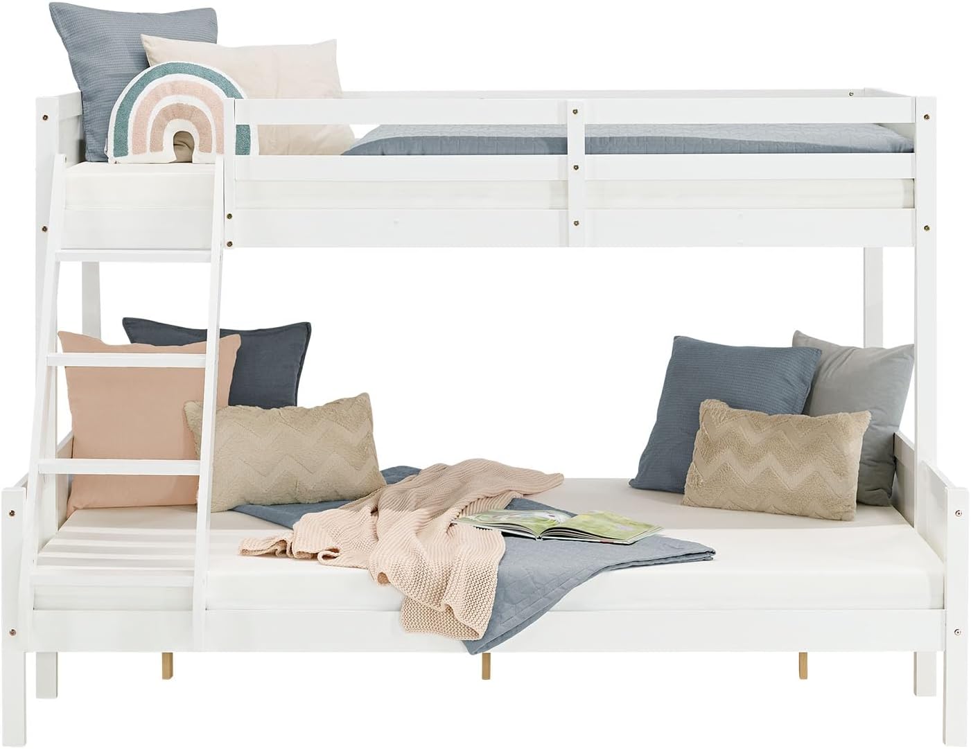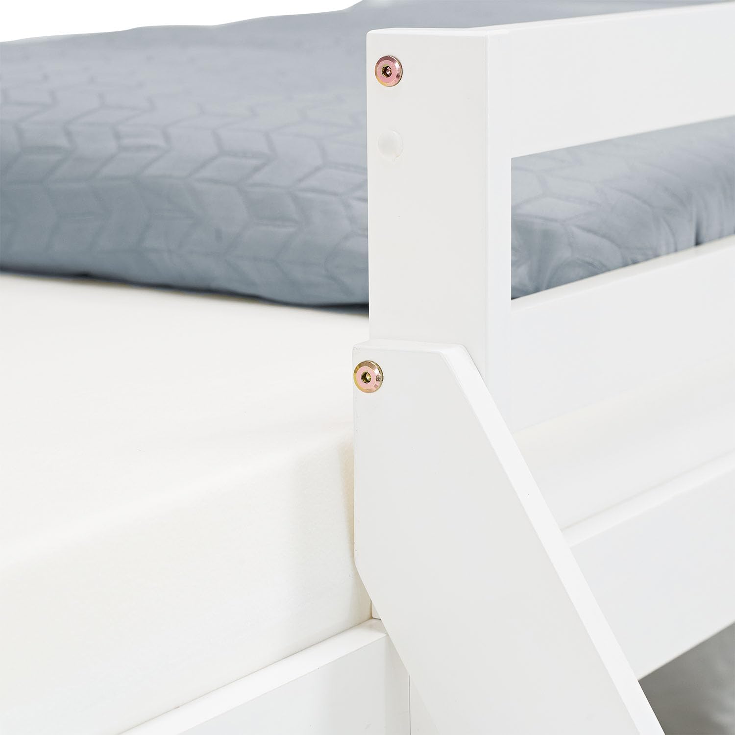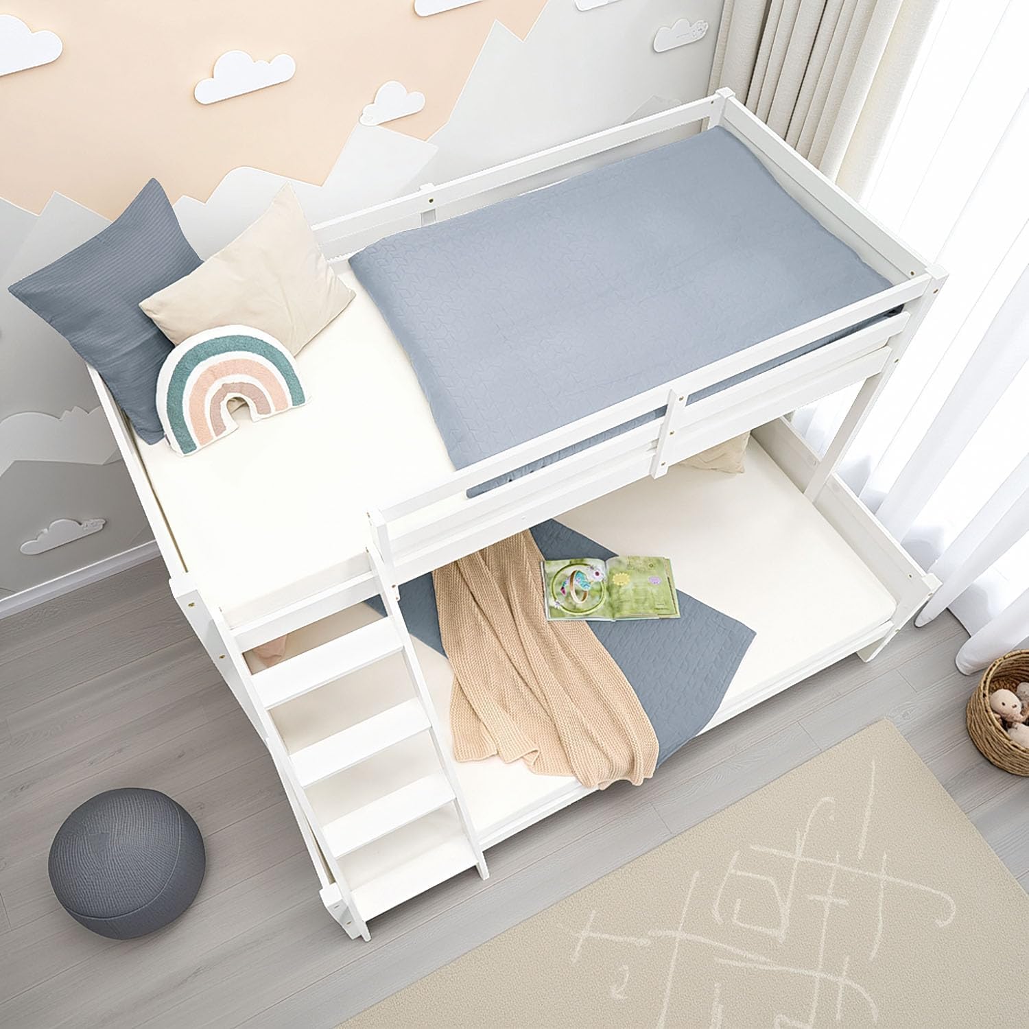 Das Bett wird mit vormontierter Leiter auf beiden Seiten geliefert. Die Roll-Lattenroste sind inklusive, wodurch eine gleichmäßige Unterlage für Matratzen entsteht. Matratze und Dekoration sind nicht enthalten, können aber individuell ergänzt werden. -