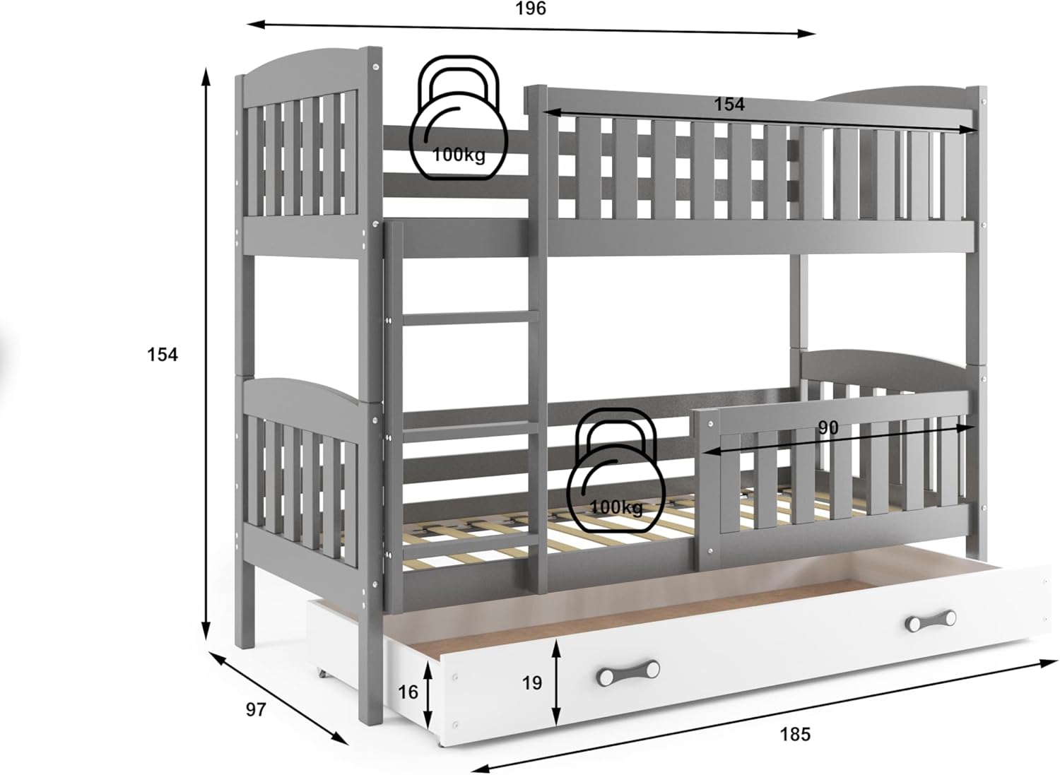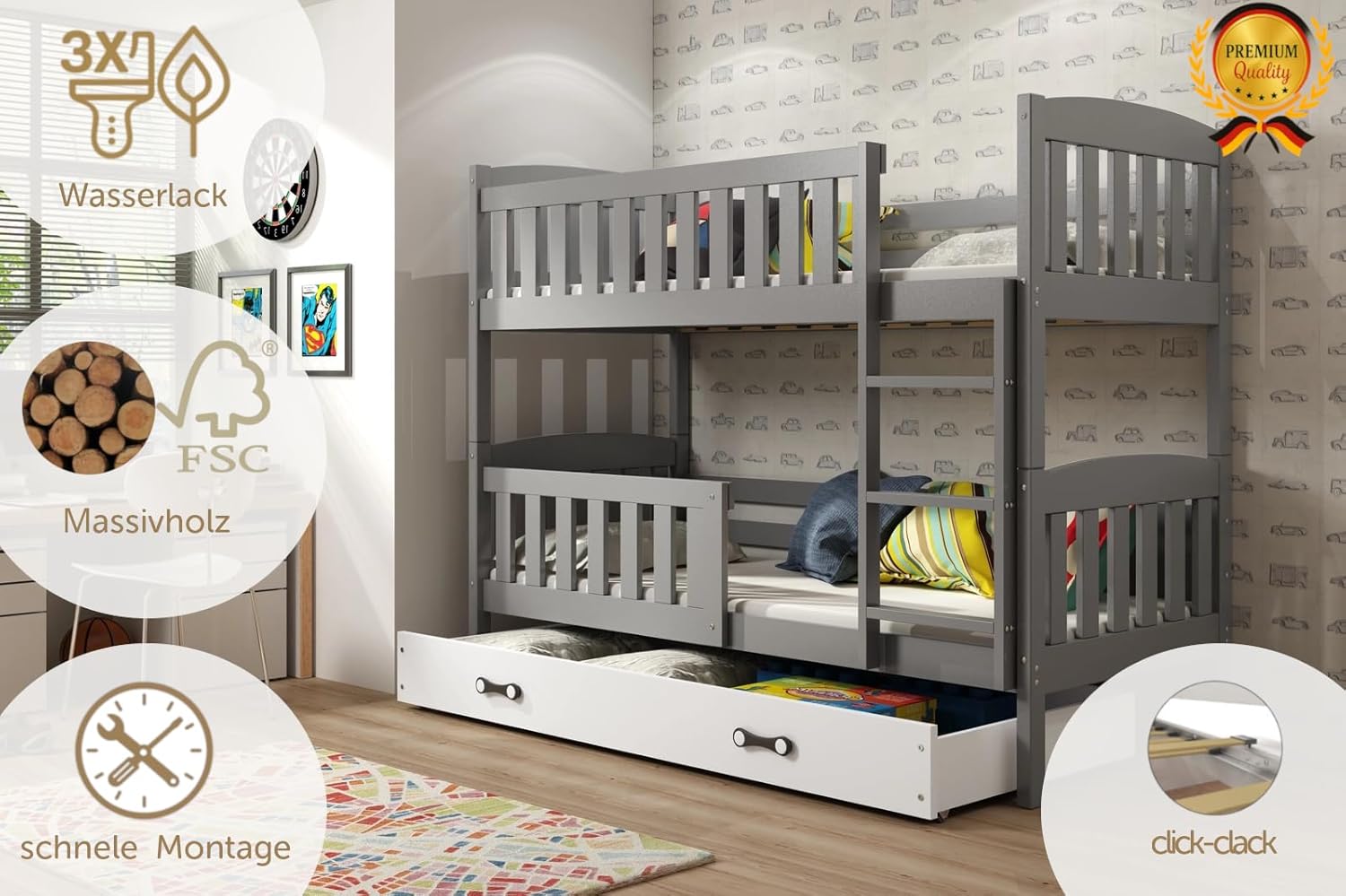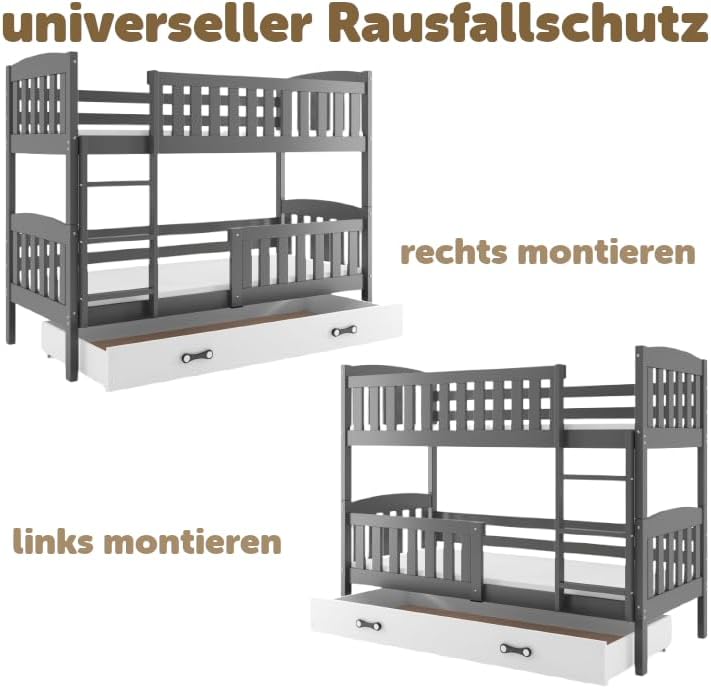Das Bett kann in zwei Einzelbetten geteilt werden und passt sich so den Bedürfnissen der Kinder an. Eine geräumige Schublade bietet zusätzlichen Stauraum für Spielzeug, Kleidung oder Zubehör. Das Design ist stabil, praktisch und in mehreren Farben erhältlich.