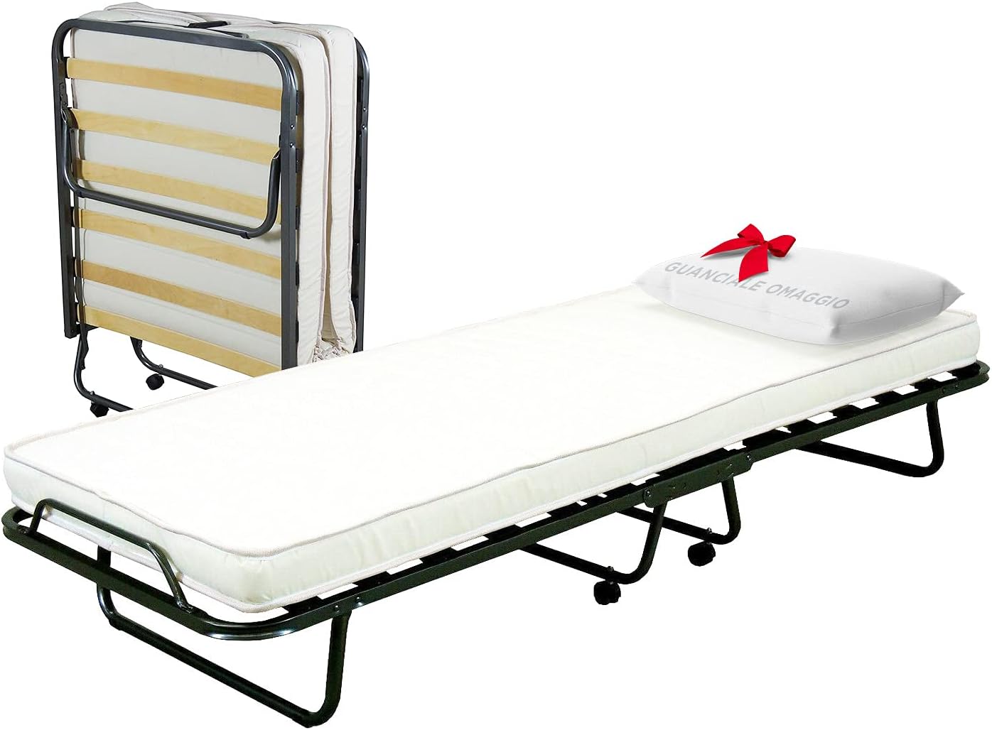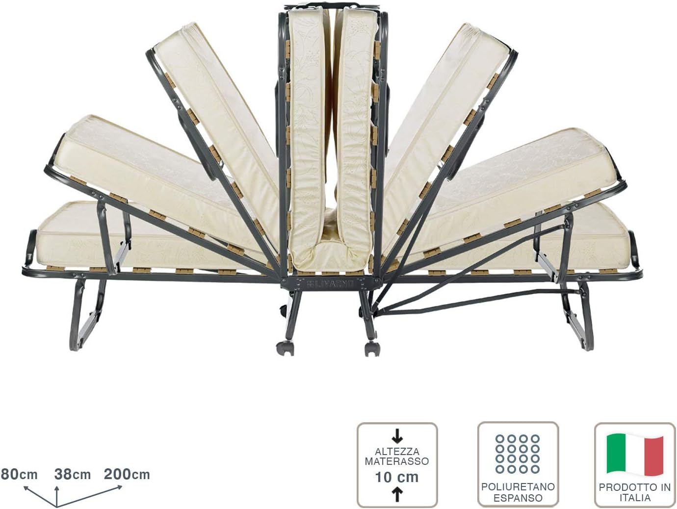 Zur sicheren Aufbewahrung wird eine praktische Staubschutzhülle mitgeliefert. Das Klappbett ist bis zu 100 kg belastbar und eignet sich perfekt für Kinder, Jugendliche oder Erwachsene. 100 % Made in Italy – Qualität, Komfort und Funktionalität in einem.