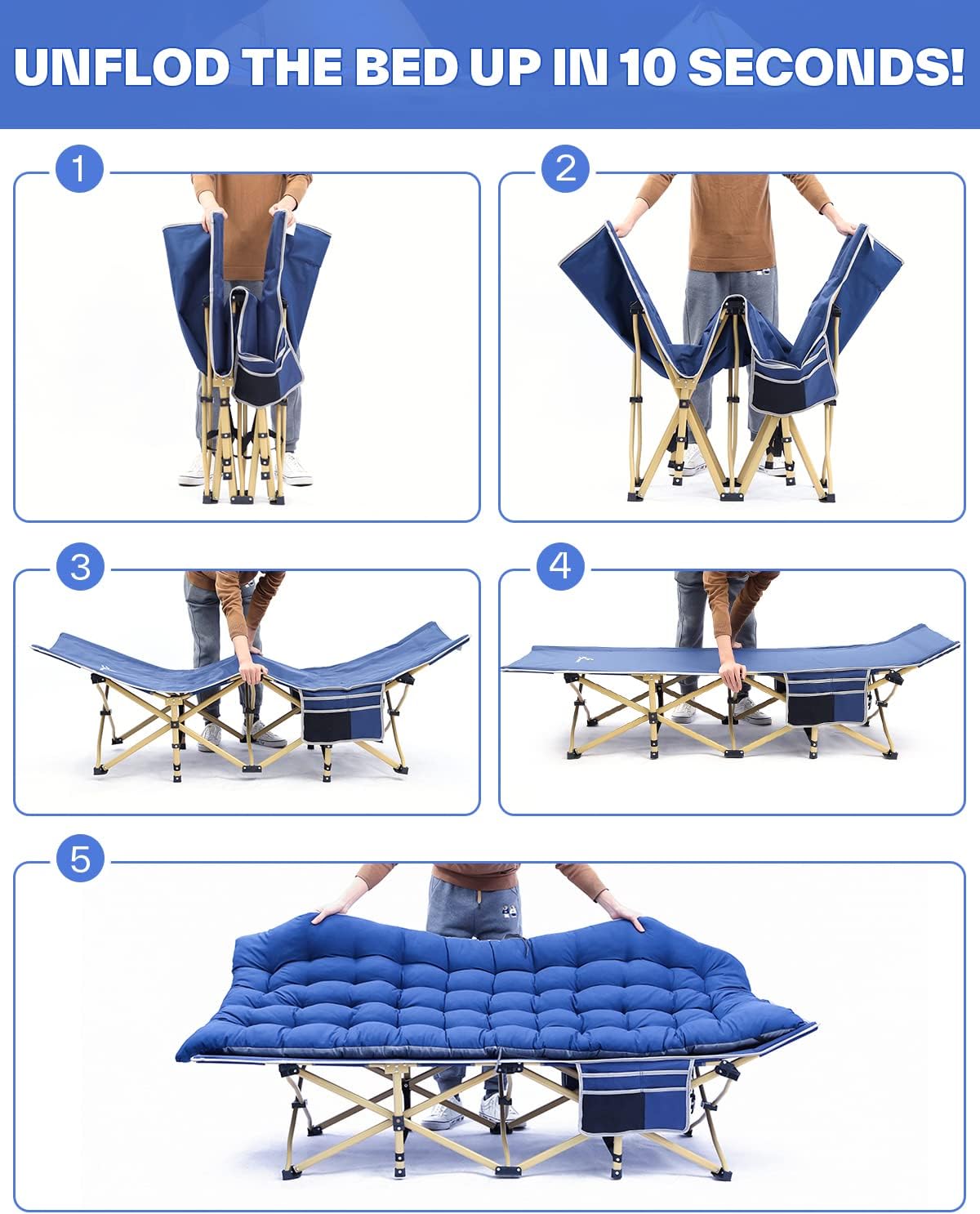 Der Aufbau des Bettes dauert weniger als 10 Sekunden – perfekt für eine unkomplizierte Handhabung. Wenn es nicht gebraucht wird, lässt sich das Bett ebenfalls in weniger als 10 Sekunden zusammenfalten und platzsparend im mitgelieferten Aufbewahrungsbeutel verstauen, ideal für Reisen oder als Gästebett.