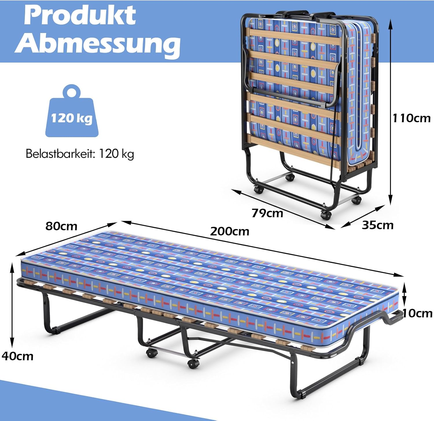 This space-saving bed folds compactly to a size of 79 x 35 x 110 cm, allowing easy storage under beds, inside cabinets, or in tight spaces. The four smooth 360° universal wheels make it effortless to move and position anywhere in your home. Ideal for apartments, offices, or guest rooms, it offers mobility, flexibility, and convenience in one design.