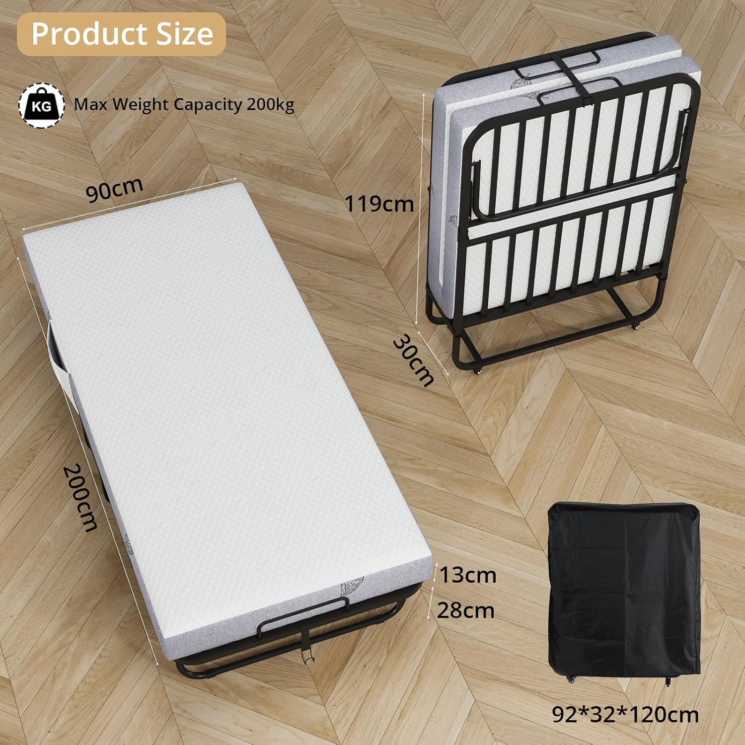 This guest bed folds easily and quickly in half for convenient storage. When folded, it measures just L 92 x W 32 x H 120 cm—compact enough to fit in closets or corners. Perfect for small apartments, offices, or guest rooms, it provides a comfortable sleeping solution without taking up permanent space. Simply fold away when not in use.