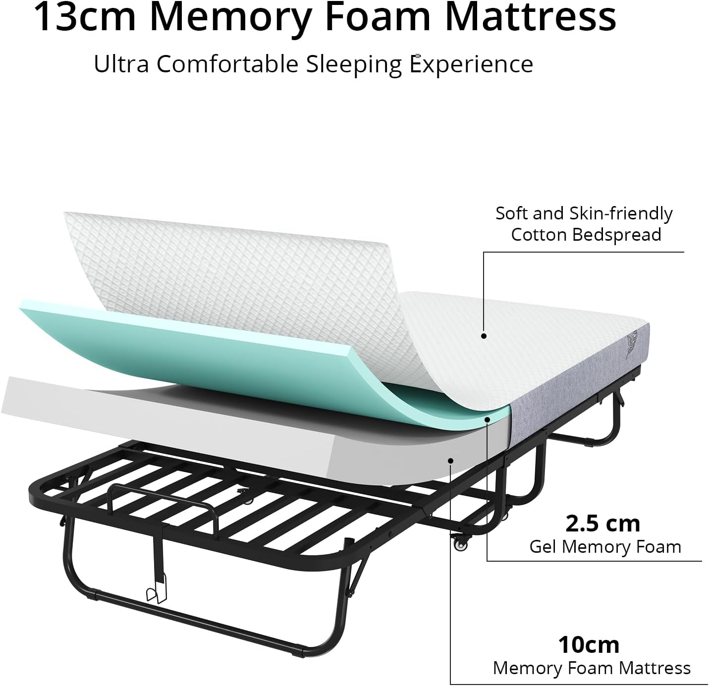 The included mattress features a 2.5 cm layer of soft memory foam combined with 10 cm of high-density support foam, delivering excellent comfort and spinal support. It adapts to body contours, relieving pressure points and ensuring quiet, uninterrupted rest. Perfect for guests or everyday use, it offers a cozy and refreshing sleep experience every time.