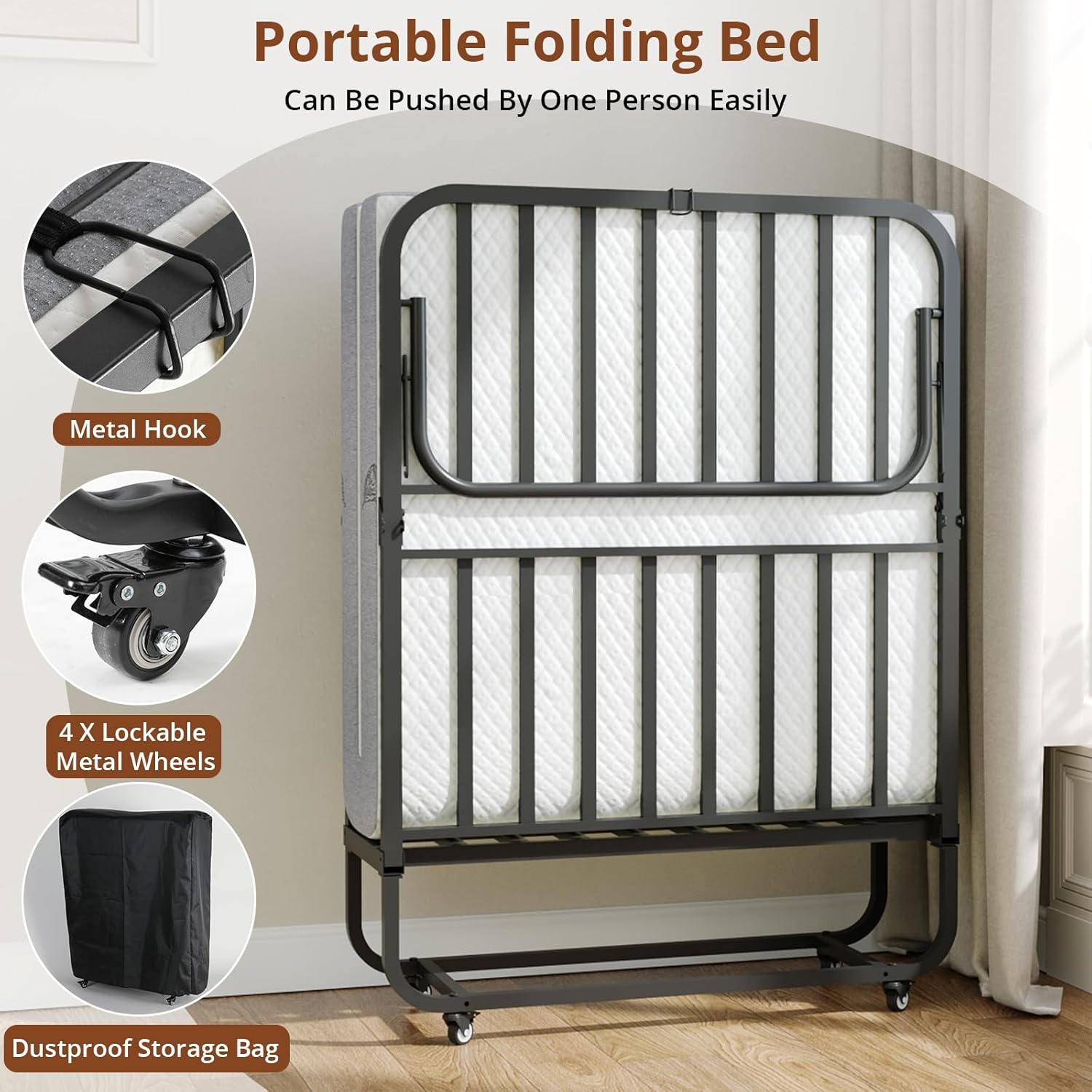 Equipped with four smooth 360° rotating wheels, this folding bed can be effortlessly moved by one person. The wheels feature a locking function to ensure full stability while in use, preventing any movement during sleep. This convenient design makes it perfect for versatile use in homes, offices, or travel, combining mobility and safety.