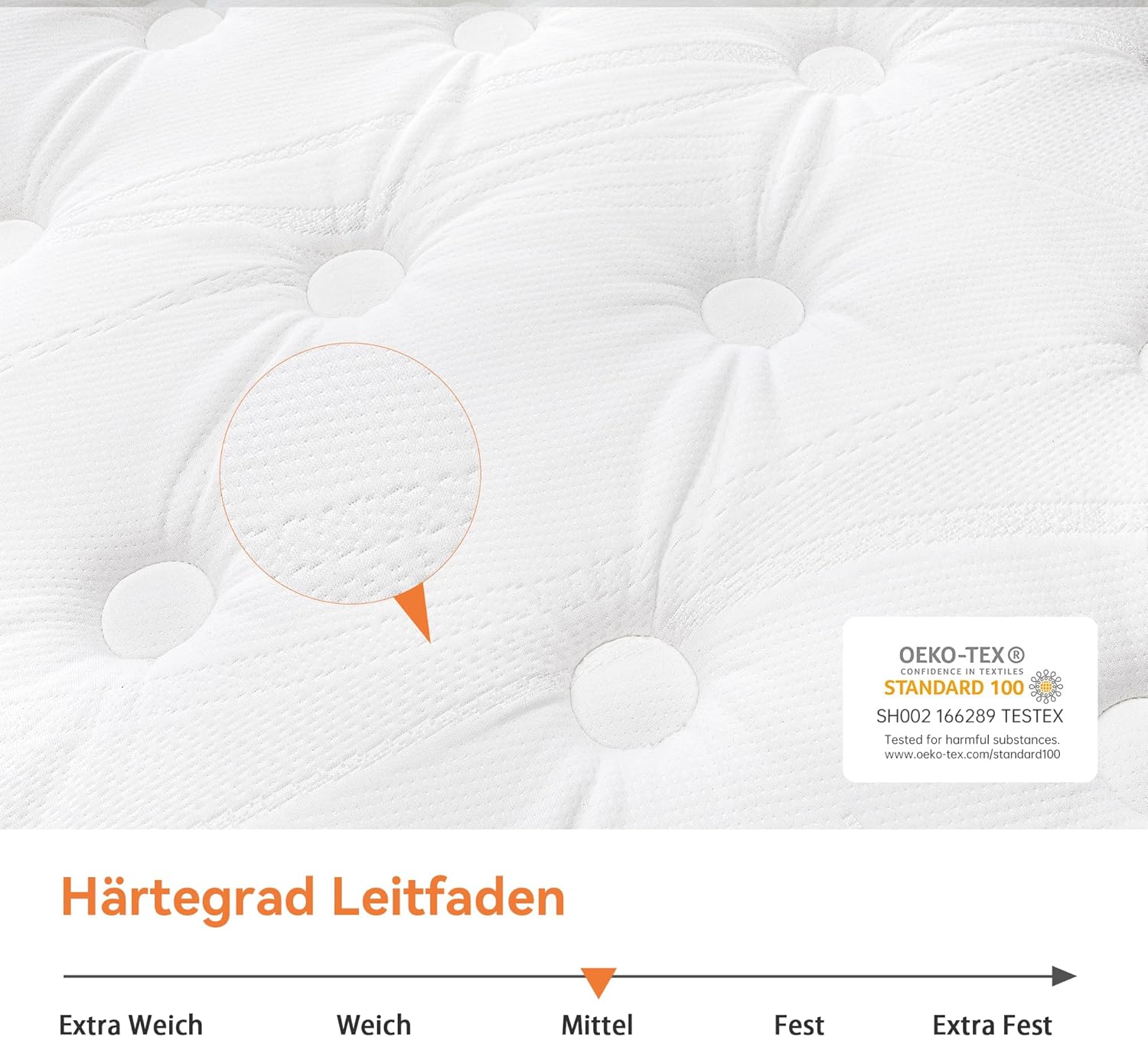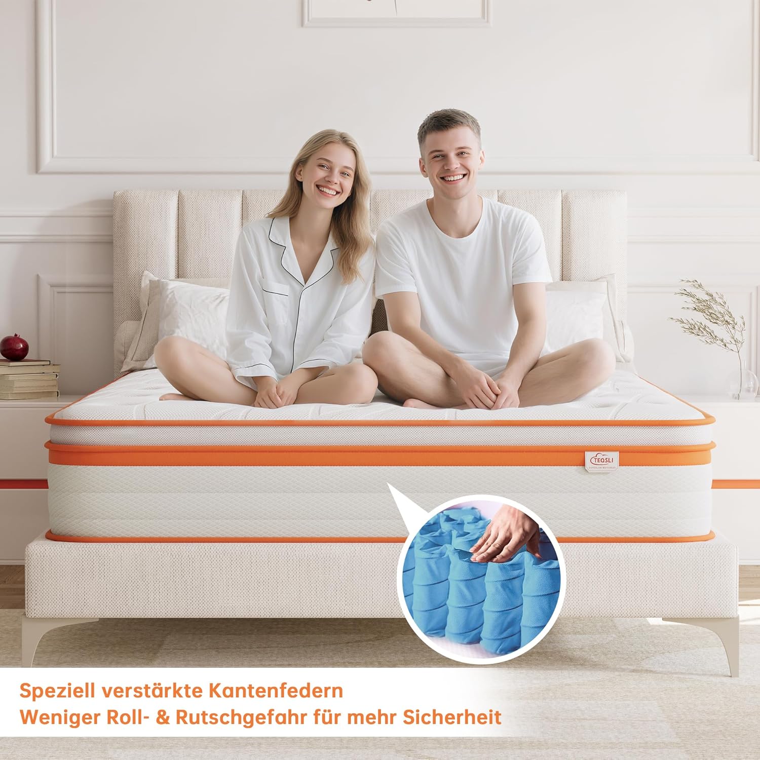 Die hochwertigen Taschenfedern reduzieren Bewegungsübertragung, sodass Partnerbewegungen nicht stören. Verstärkte Randfedern sorgen für Stabilität beim Ein- und Aussteigen. So bleibt die Matratze formstabil, komfortabel und langlebig. Perfekt für Paare, die nachts ungestört schlafen und gleichzeitig ergonomische Unterstützung genießen möchten.