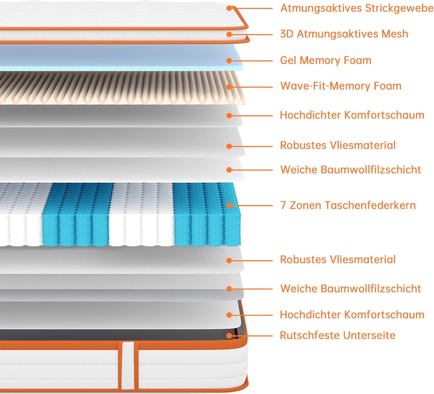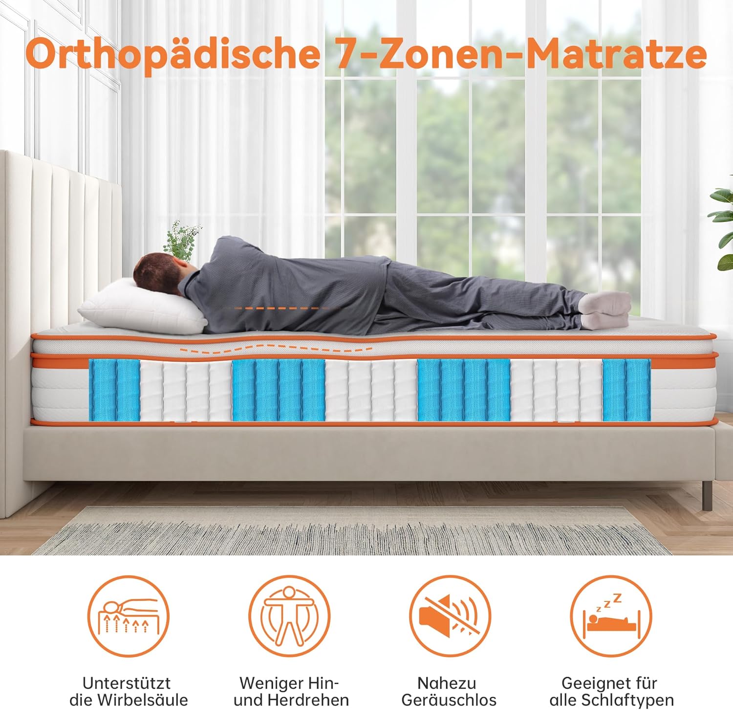 Die 25 cm hohe Hybridmatratze 140×200 cm kombiniert Taschenfedern mit Gel-Memory-Schaum für optimale ergonomische Unterstützung. Das 7-Zonen-System passt sich jeder Körperpartie präzise an, entlastet Rücken, Schultern und Hüfte und fördert eine gesunde Schlafhaltung, wodurch erholsamer, entspannter Schlaf ermöglicht wird.