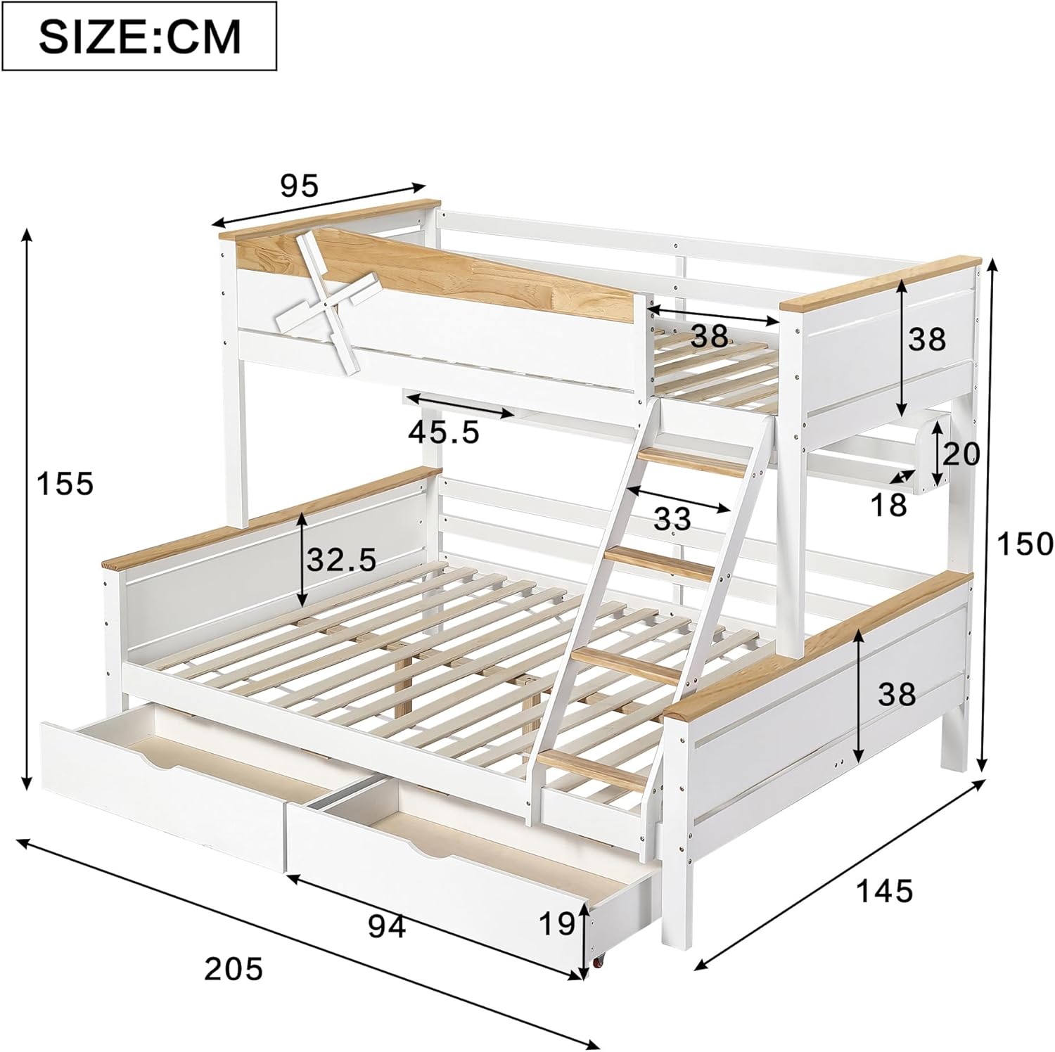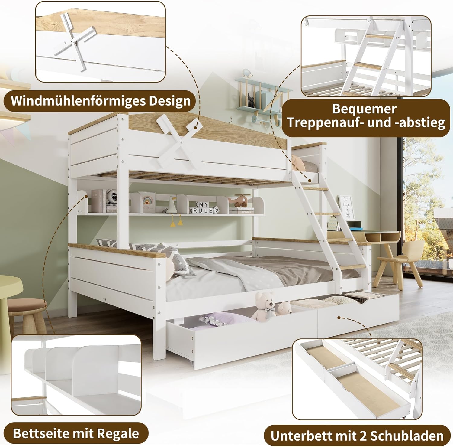 Das obere Bett verfügt über integrierte Regalfächer für Bücher, Spielzeug oder Dekoartikel. Das untere Doppelbett bietet zwei große Schubladen, die reichlich Platz für Bettwäsche, Kleidung oder Spielsachen schaffen – so bleibt das Kinderzimmer ordentlich und übersichtlich.