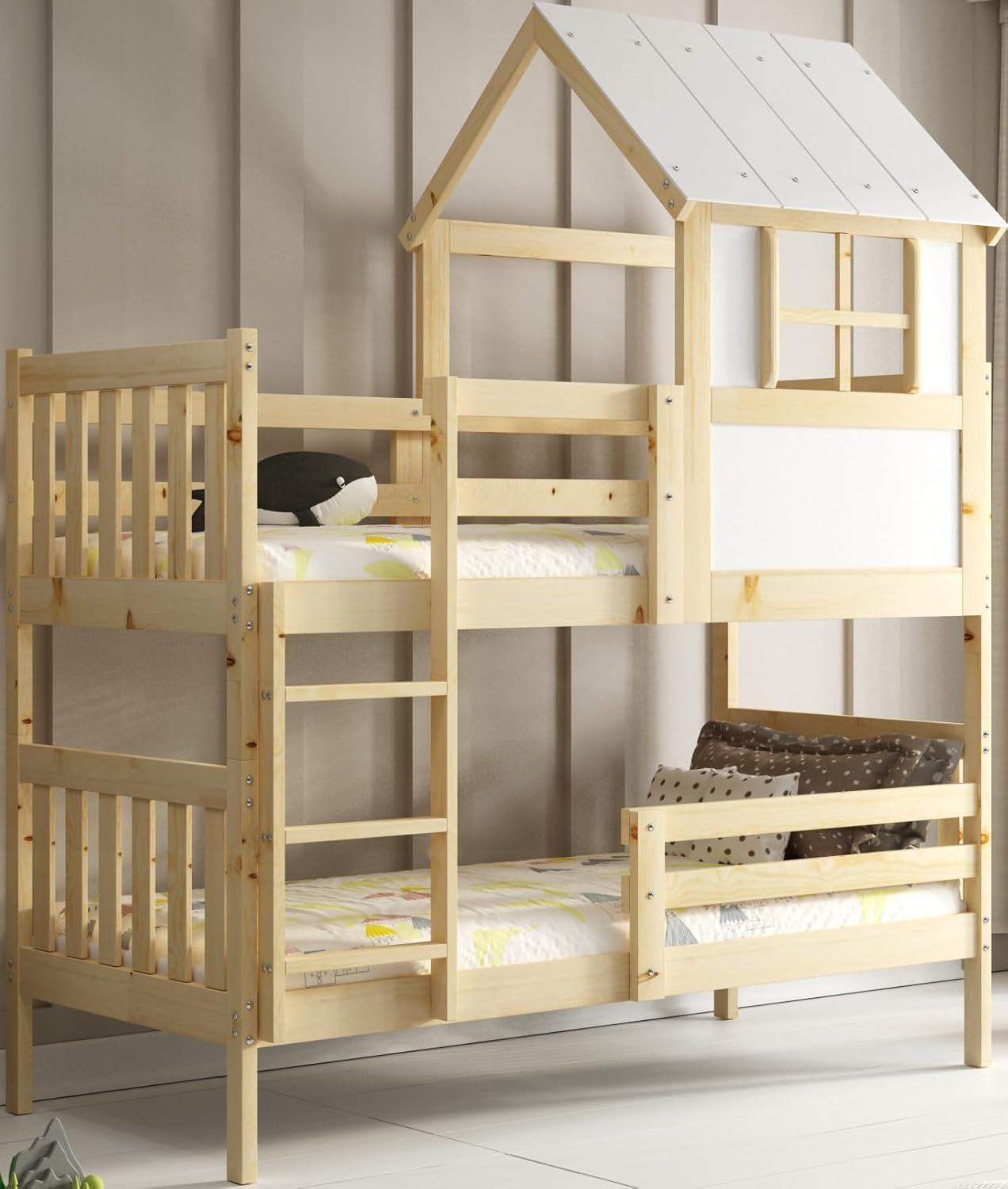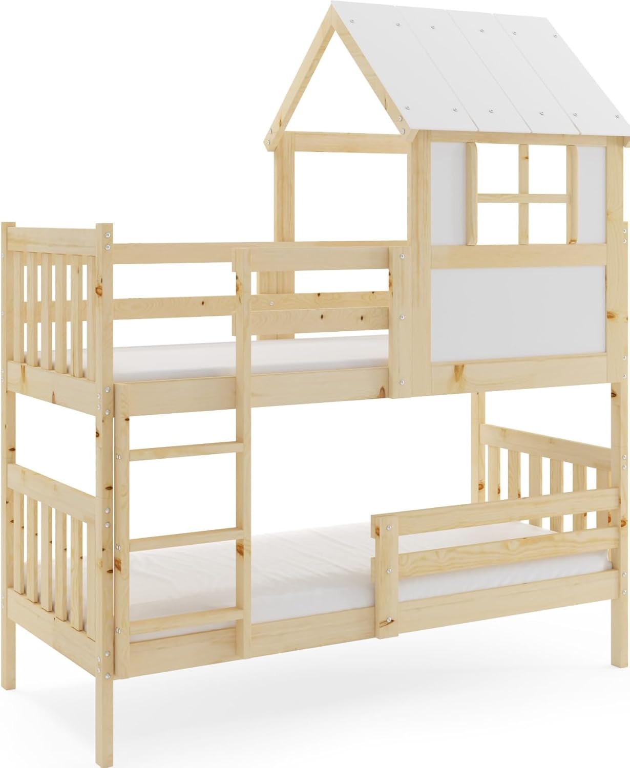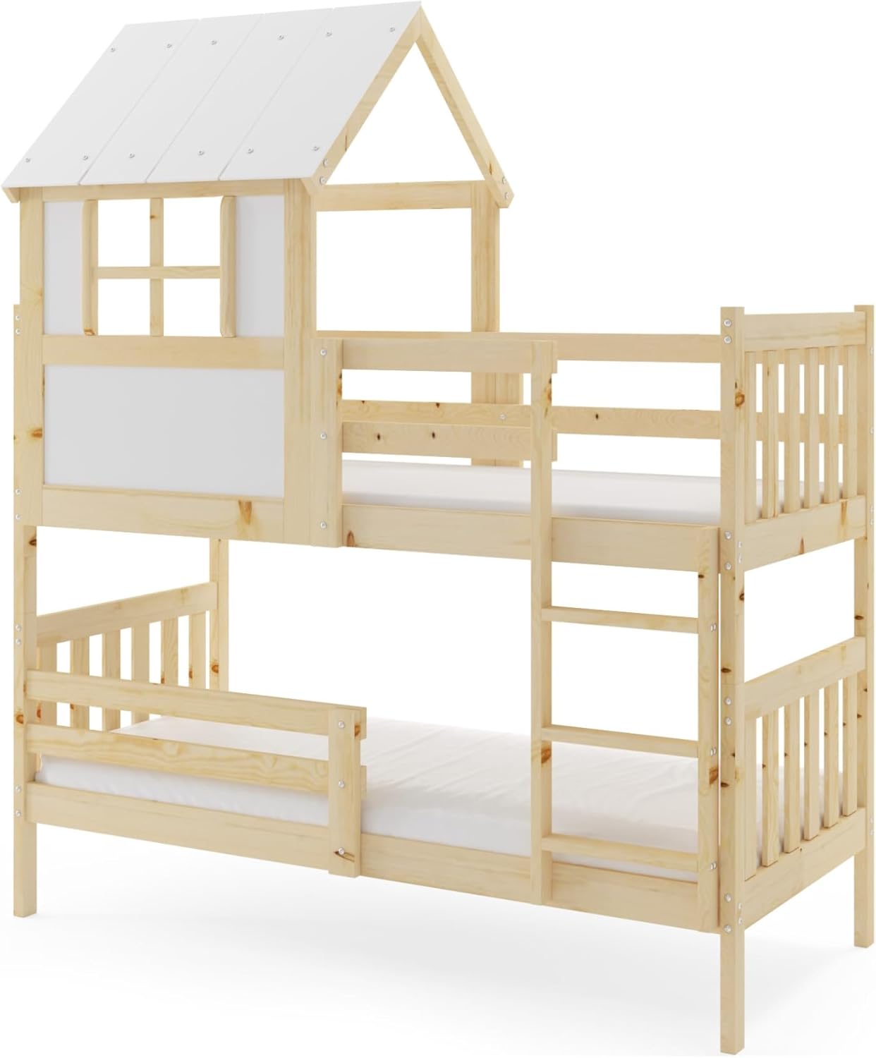Das charmante Hausdesign mit Dach und kleinem Fenster schafft eine gemütliche Schlaf- und Spieloase. Das unbehandelte Holz kann individuell bemalt oder lackiert werden. Das Bett lässt sich zudem in zwei Einzelbetten trennen – perfekt für Geschwister oder Gäste.