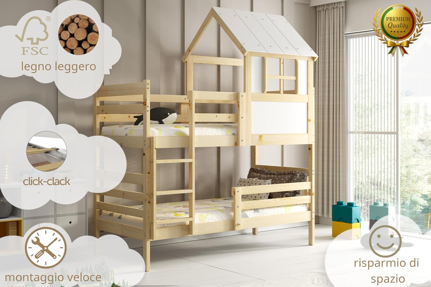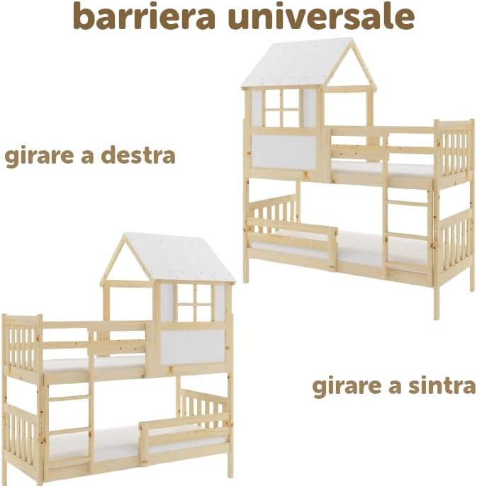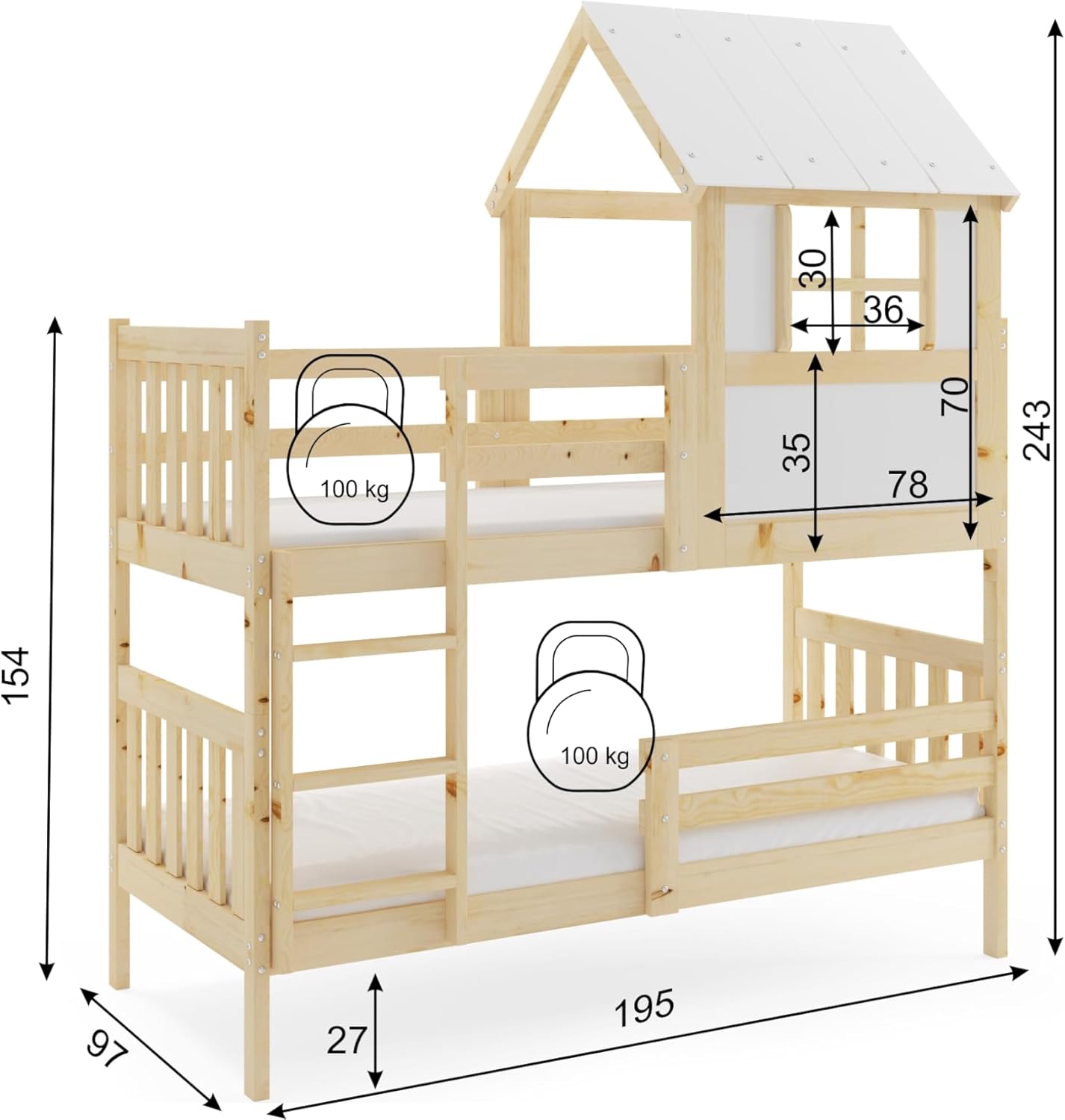 Das charmante Hausdesign mit Dach und kleinem Fenster schafft eine gemütliche Schlaf- und Spieloase. Das unbehandelte Holz kann individuell bemalt oder lackiert werden. Das Bett lässt sich zudem in zwei Einzelbetten trennen – perfekt für Geschwister oder Gäste.