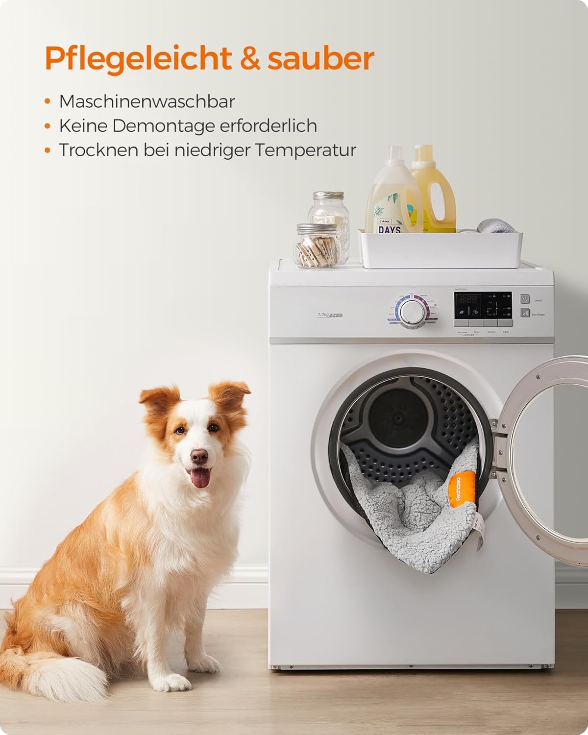 Einfache Pflege: Kein aufwändiges Abnehmen nötig – die Decke ist maschinenwaschbar und kann bei niedriger Temperatur im Trockner getrocknet werden, was die Reinigung schnell und einfach macht.