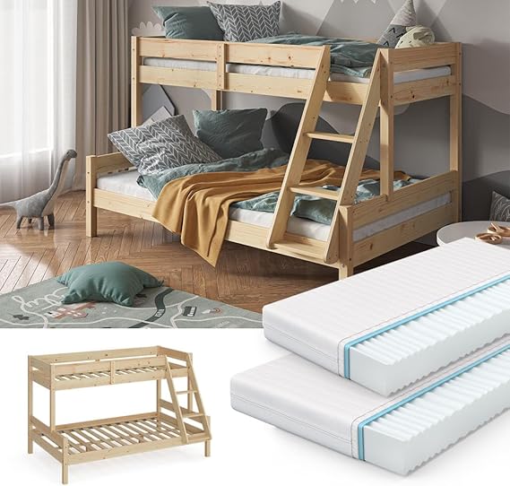 The bed accommodates spacious mattress sizes to provide flexibility and comfort for different ages. The lower bunk fits a 200 x 120 cm mattress, while the upper bunk fits a 200 x 80 cm mattress, making it suitable for siblings or guests. With a height of 131 cm, it fits well into most bedrooms. Detailed measurements in the product photos help ensure a perfect fit in your space.