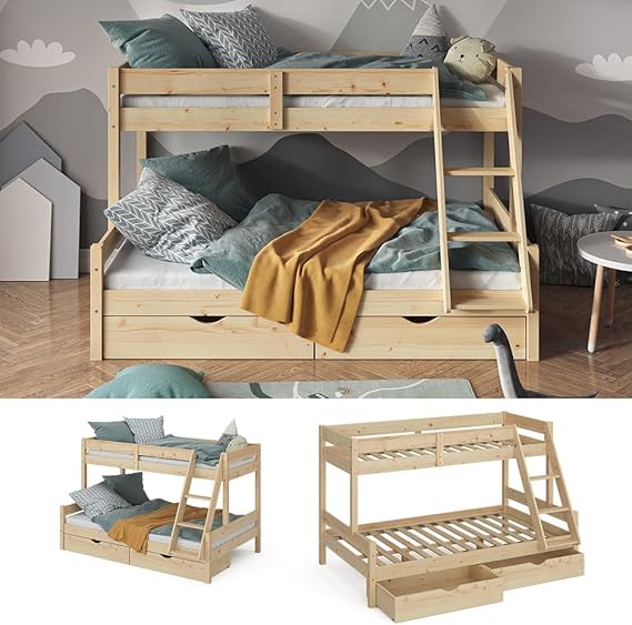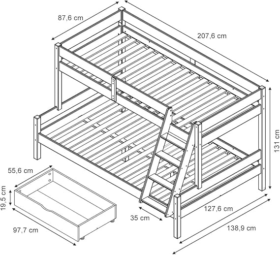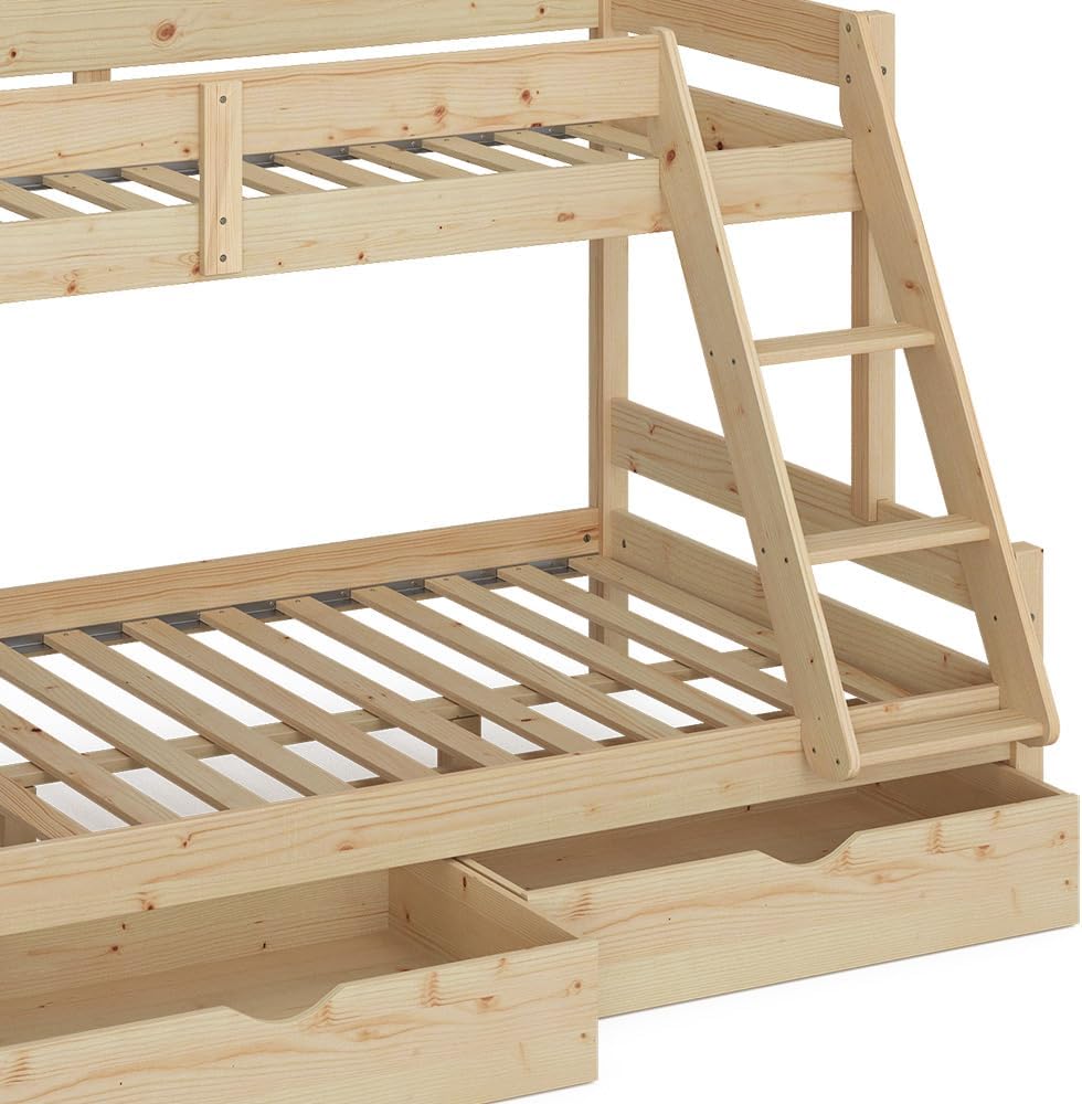 Built from durable natural pine wood, this bunk bed provides a strong and stable structure designed to withstand daily use by active children. The sturdy wooden frame ensures long-lasting support and a secure sleeping environment, while the natural finish adds a warm and timeless appearance to the room. A reliable furniture choice that blends strength, safety, and family-friendly design.