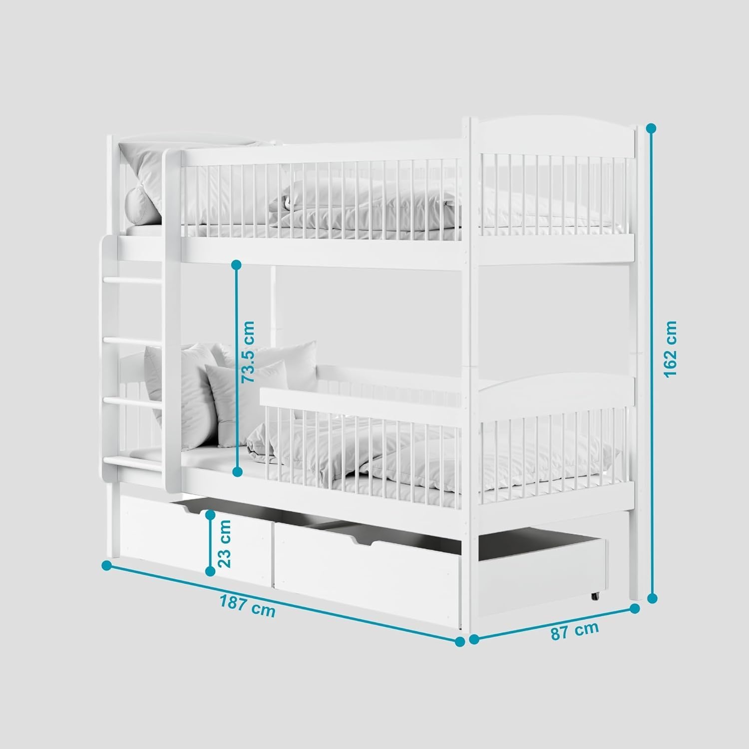 Unter dem Bett befinden sich zwei geräumige Schubladen, die zusätzlichen Stauraum für Bettwäsche, Spielzeug oder Kleidung bieten. So bleibt das Kinderzimmer ordentlich, während wichtige Dinge stets griffbereit und gut organisiert sind.