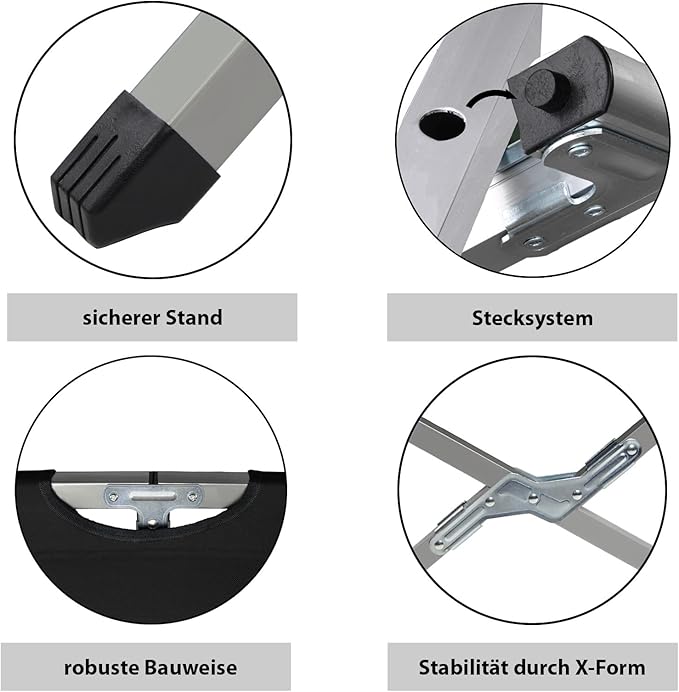Robustes Stahlgestänge mit pulverbeschichteter Oberfläche für optimalen Korrosionsschutz. Die X-förmige Beinkonstruktion sorgt für sicheren Stand auf jedem Untergrund.