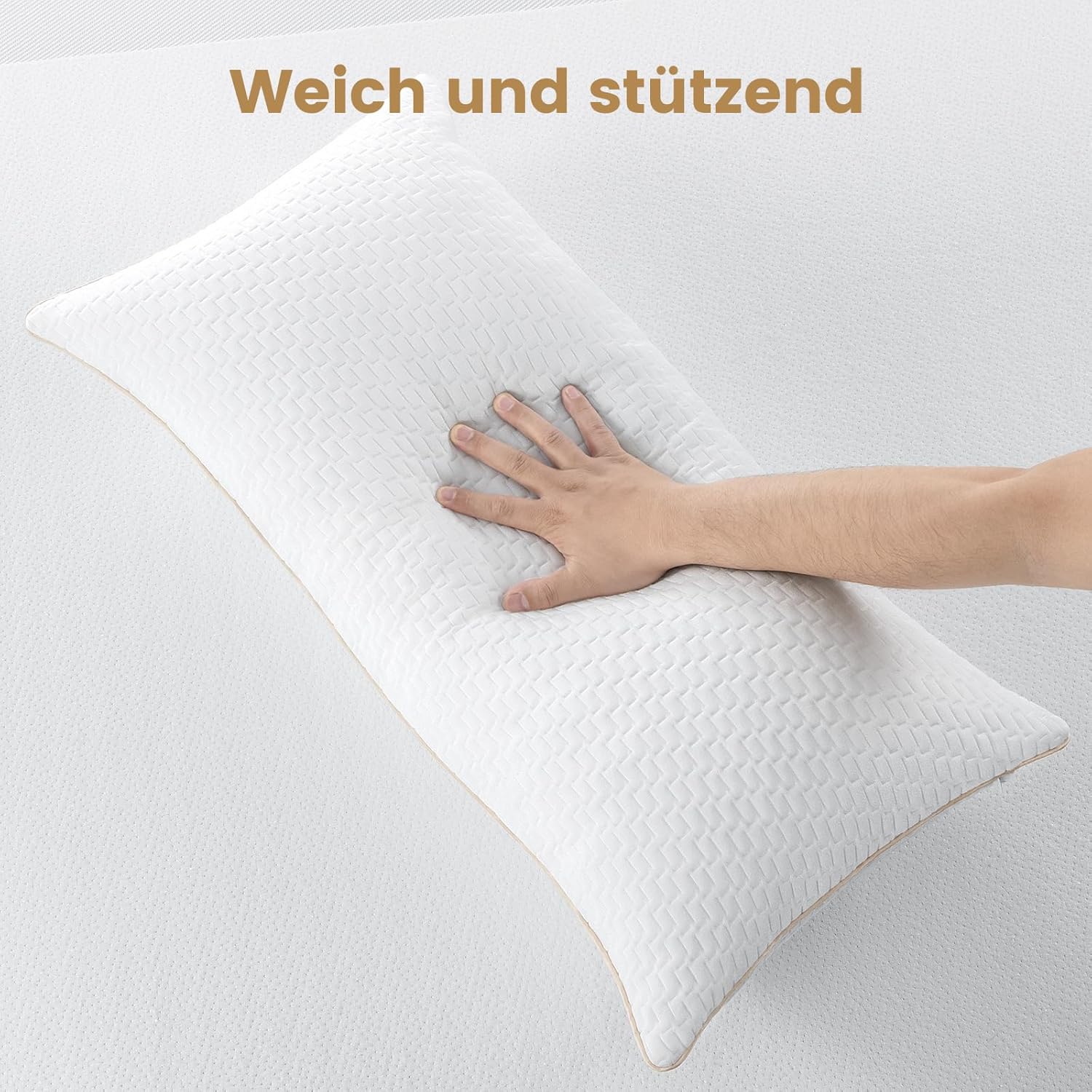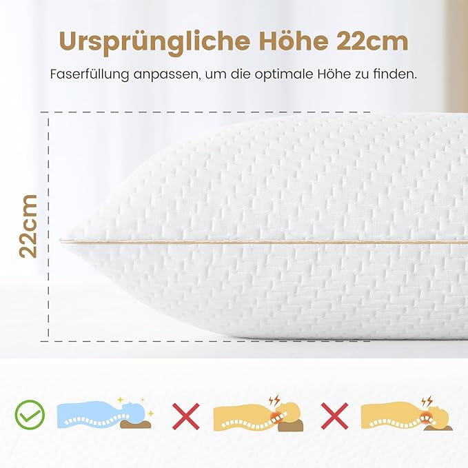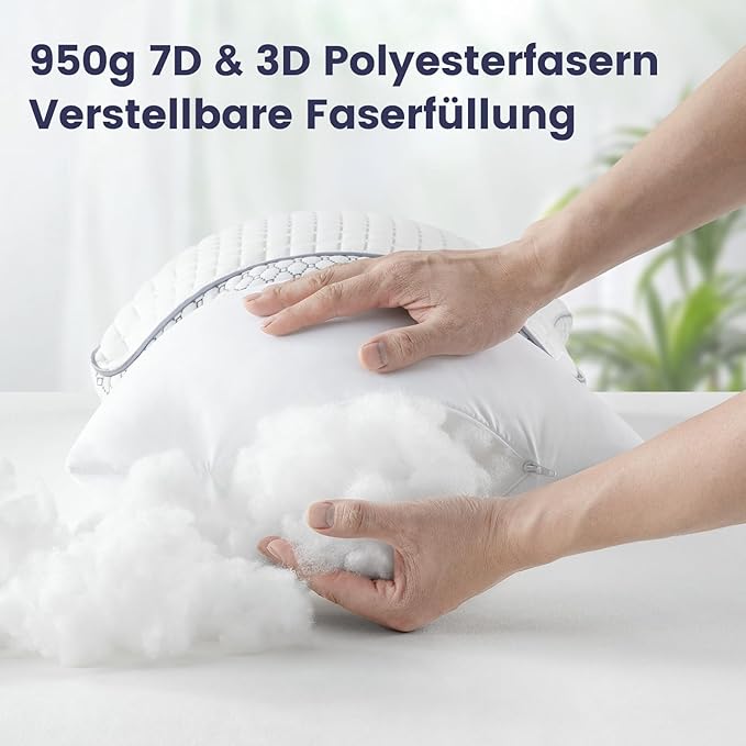 Jedes Kissen ist mit 950 g hochwertigen 7D- & 3D-Polyesterfasern gefüllt, die für eine besonders weiche und voluminöse Liegefläche sorgen. Bei Bedarf lässt sich die Füllung durch Ausklopfen oder Waschen leicht auffrischen und behält lange ihre Form.