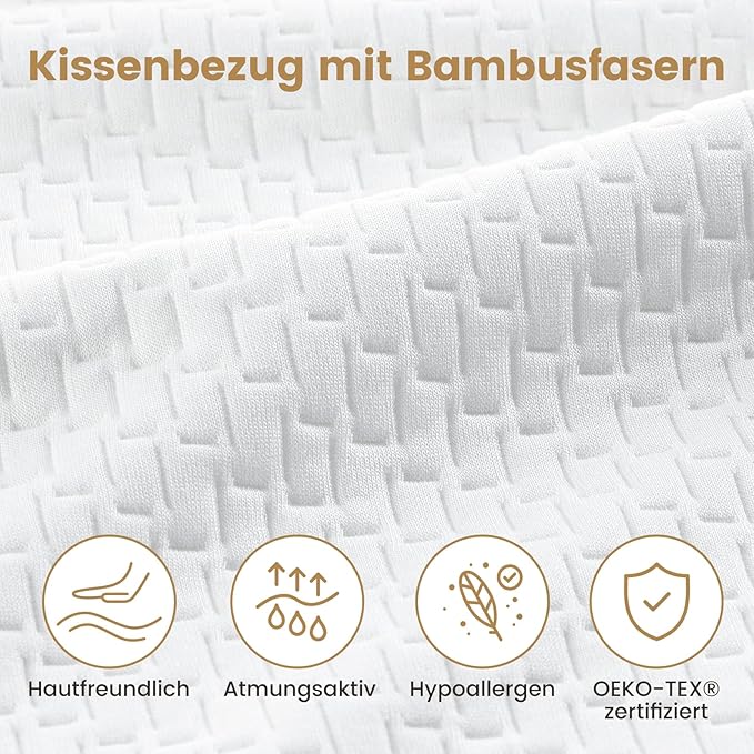 Der Bezug enthält hochwertige Bambusfasern, die das Kissen 40×80 cm effektiv antibakteriell und antimilben schützen. Gleichzeitig sorgt die natürliche Faser für optimale Wärmeableitung und ein angenehm frisches Schlafklima.