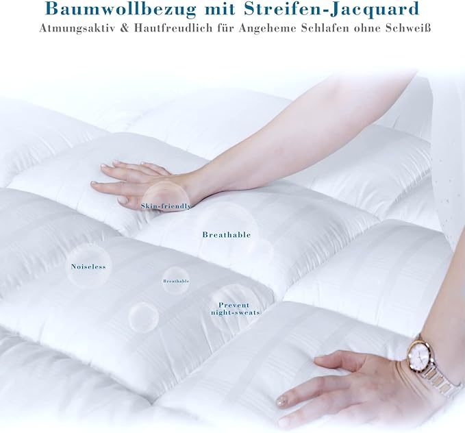 Der Bezug aus 100 % reiner, atmungsaktiver Baumwolle leitet überschüssige Wärme ab und hält die Schlaftemperatur angenehm – Schluss mit nächtlichem Schwitzen durch überhitzte Matratzen oder Memory-Foam-Topper.