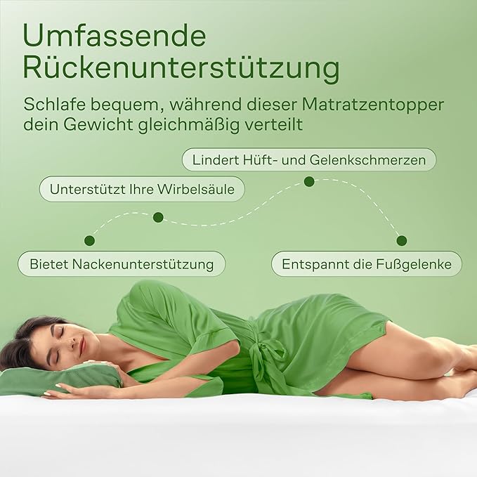 Die zusätzliche Polsterung kann zur Linderung von Rückenschmerzen beitragen. Die Auflage ist kühlend, schweißabsorbierend und frei von schädlichen Chemikalien wie Latex oder Formaldehyd.